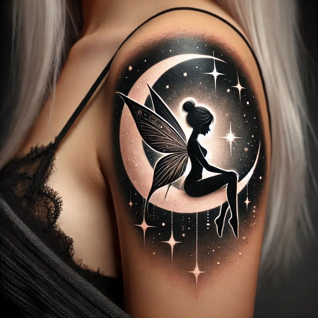 A fairy perched on the crescent moon, her wings glowing softly under the light of the night sky – this tattoo design is full of mystery and magic. The moon has always symbolized intuition, emotion, and transformation. The fairy, with her gentle glow, represents the soul’s journey through darkness and light.