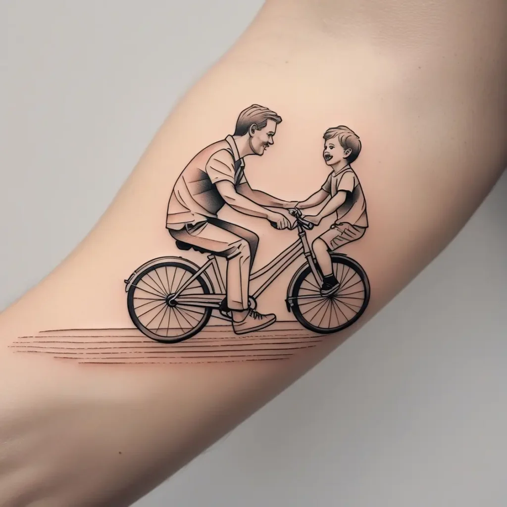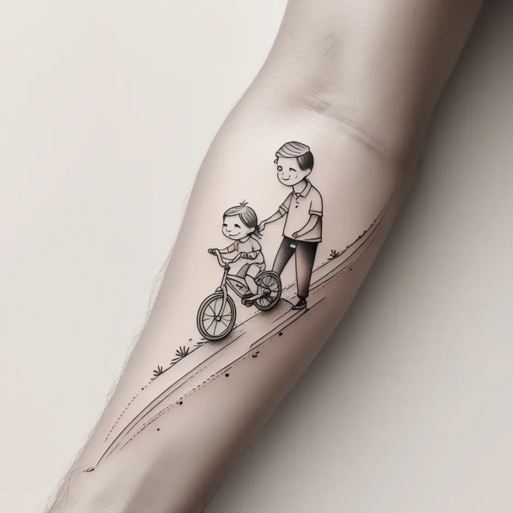 Description: A detailed tattoo capturing a memory, like teaching you to ride a bike or fishing together.
