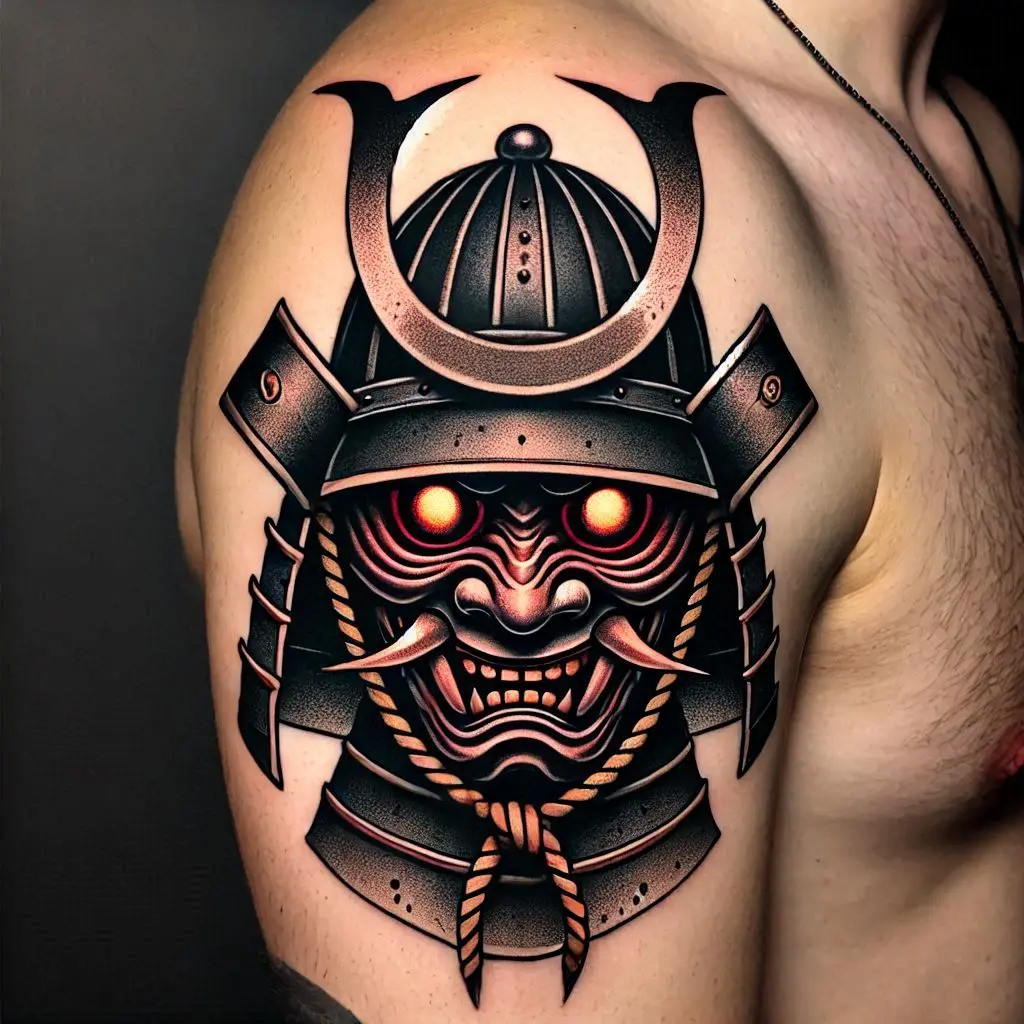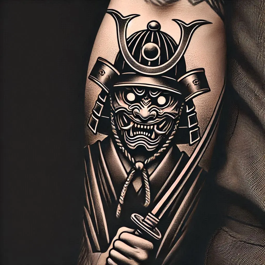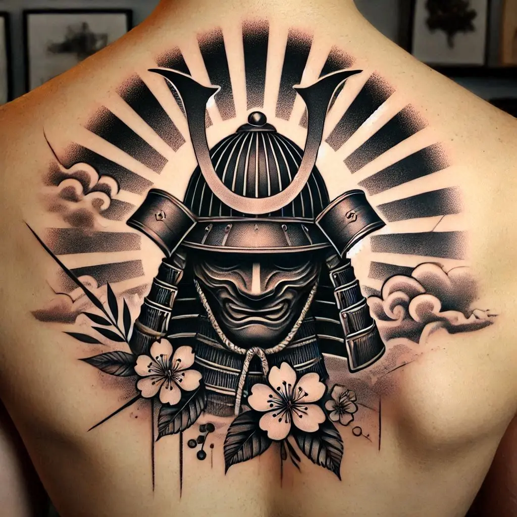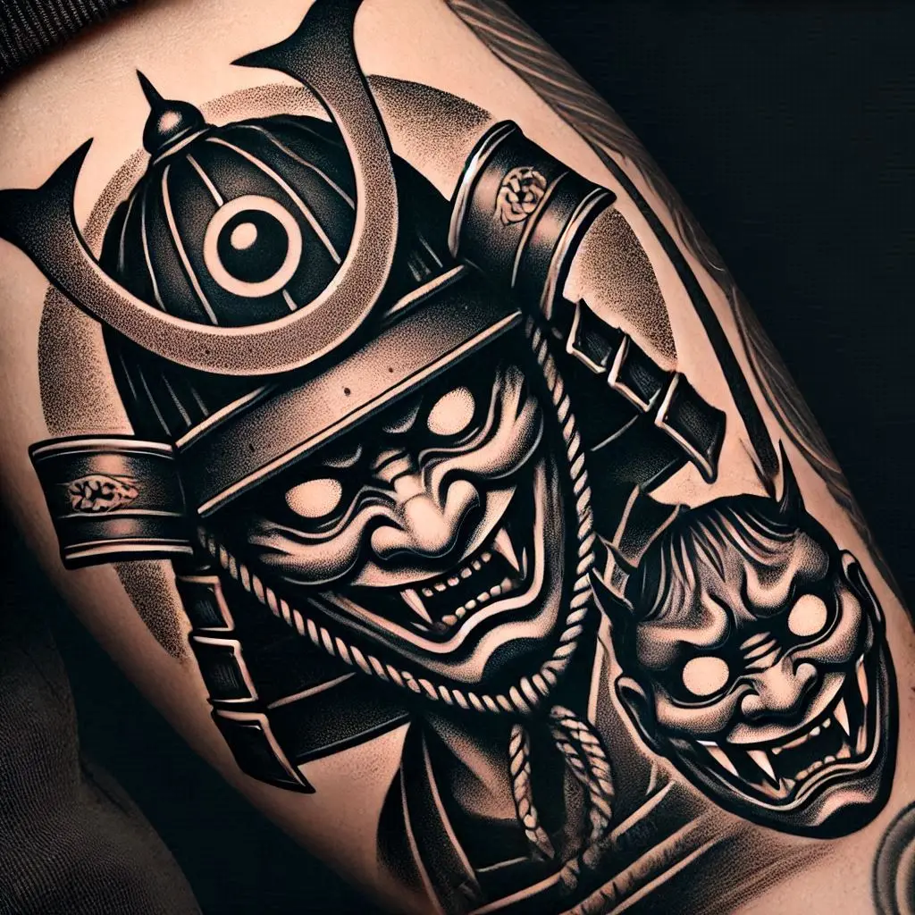 The kabuto (samurai helmet) often features a terrifying mask, symbolizing a warrior’s fierce spirit. This tattoo combines the power of the samurai with the mystique of traditional Japanese masks.