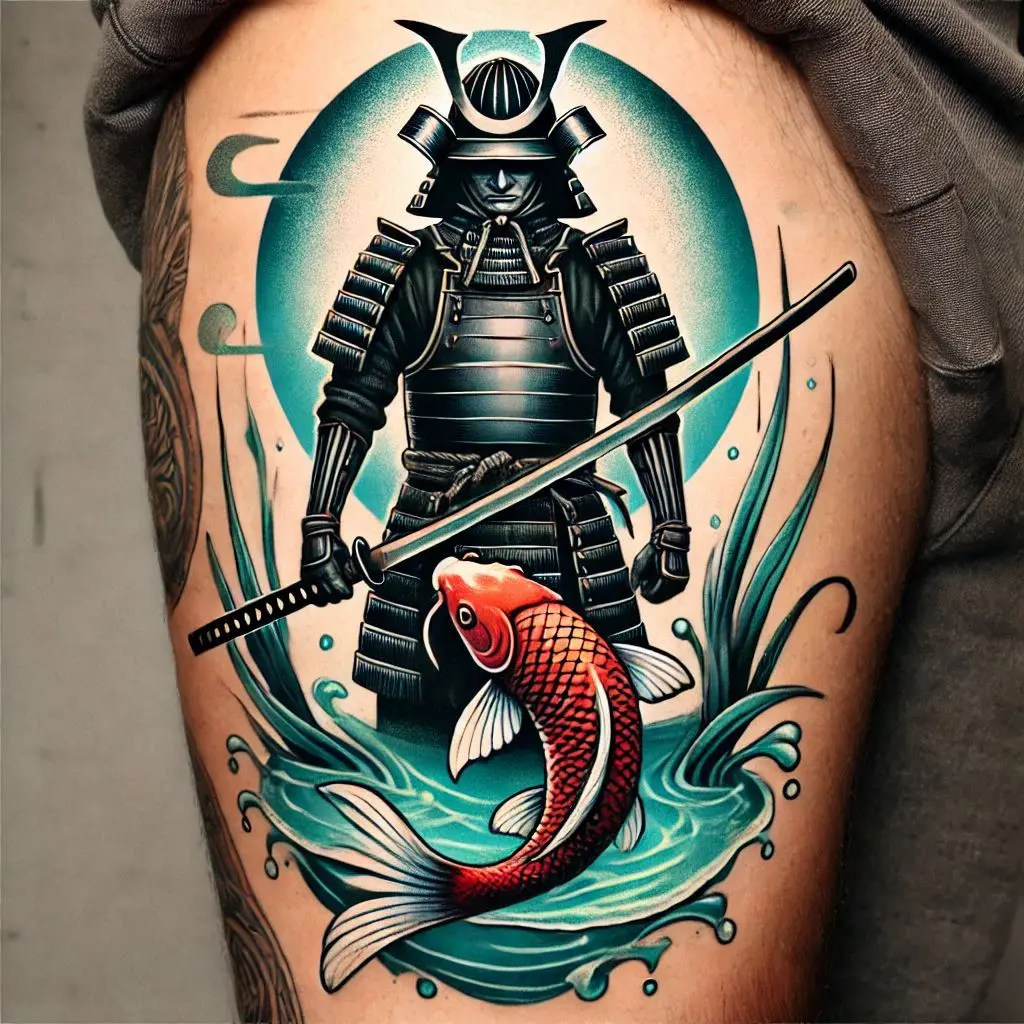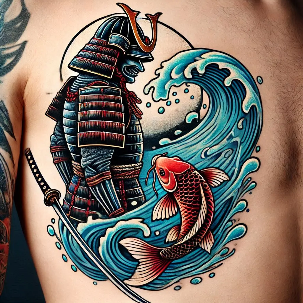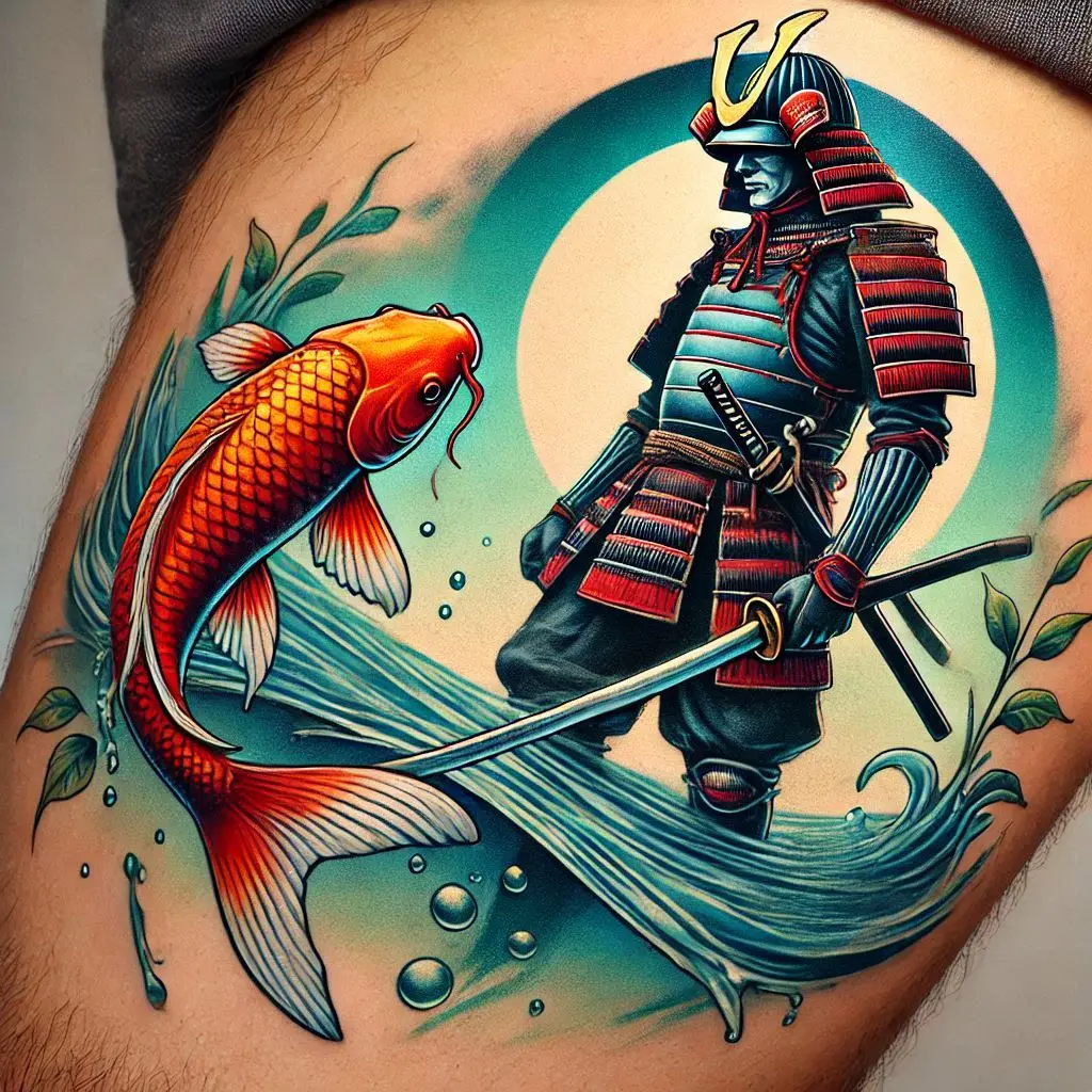 In Japanese culture, the koi fish symbolizes perseverance and strength, as it’s known for swimming upstream. Pairing it with a samurai creates a beautiful contrast between grace and power.