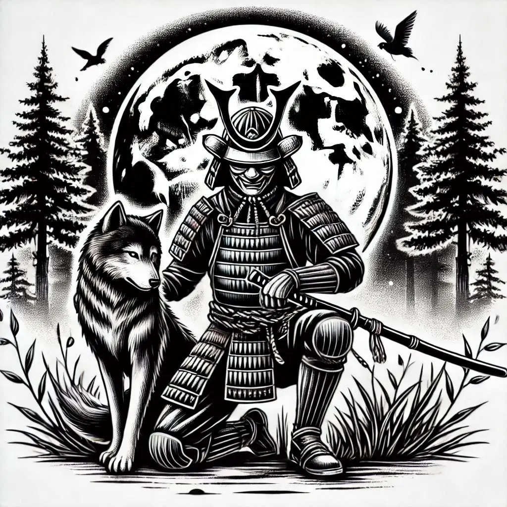 A masked samurai with a loyal wolf companion creates a powerful duo, symbolizing protection, loyalty, and courage.