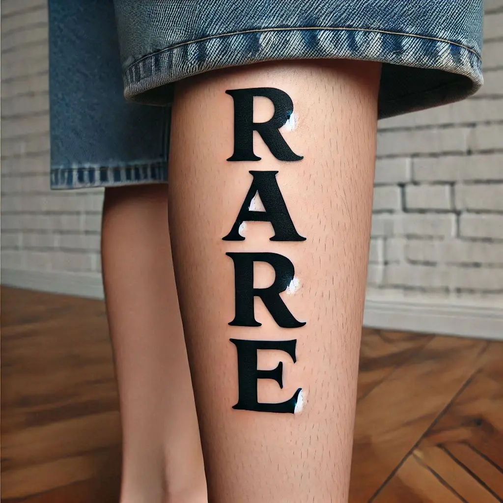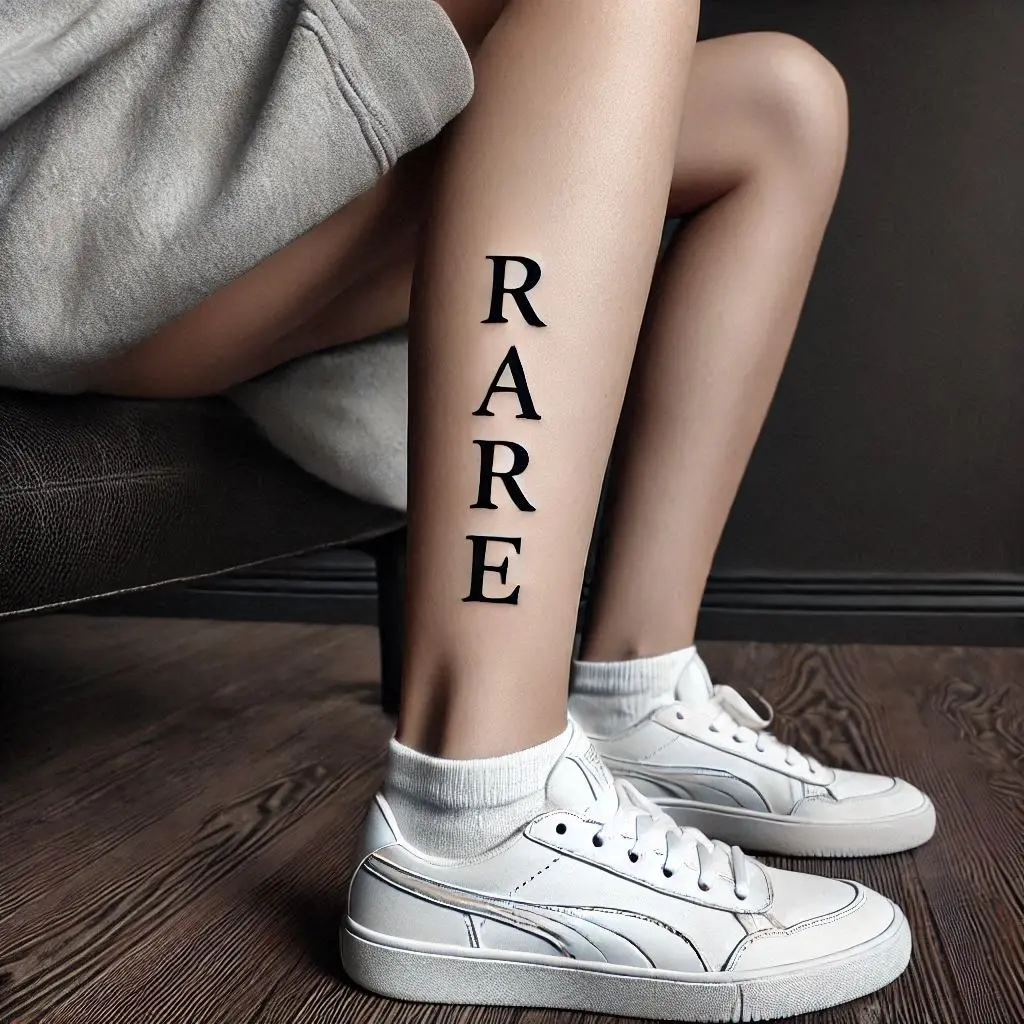 Meaning: “Rare” on your calf symbolizes moving forward with purpose. It’s a reminder that every step you take is part of your unique journey.