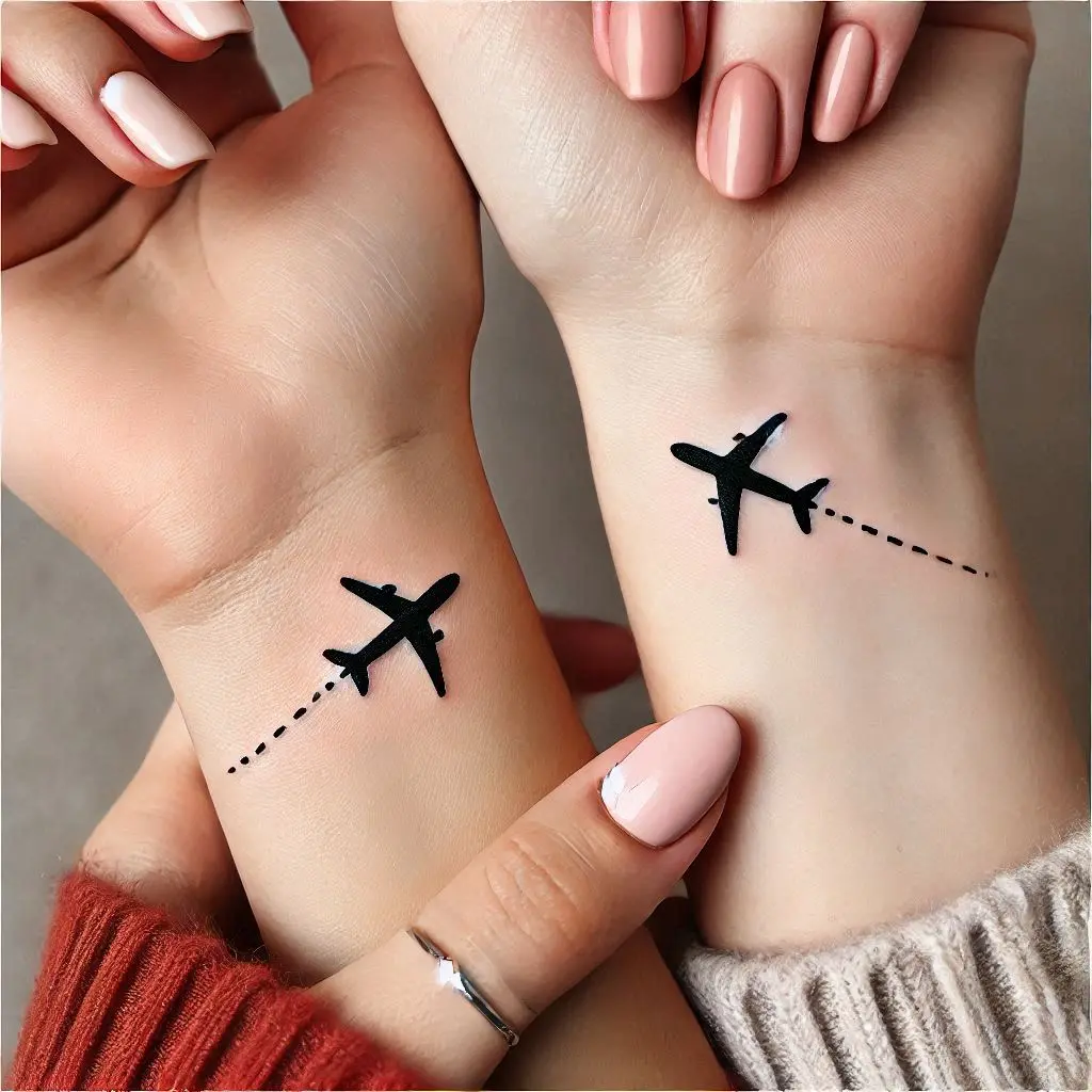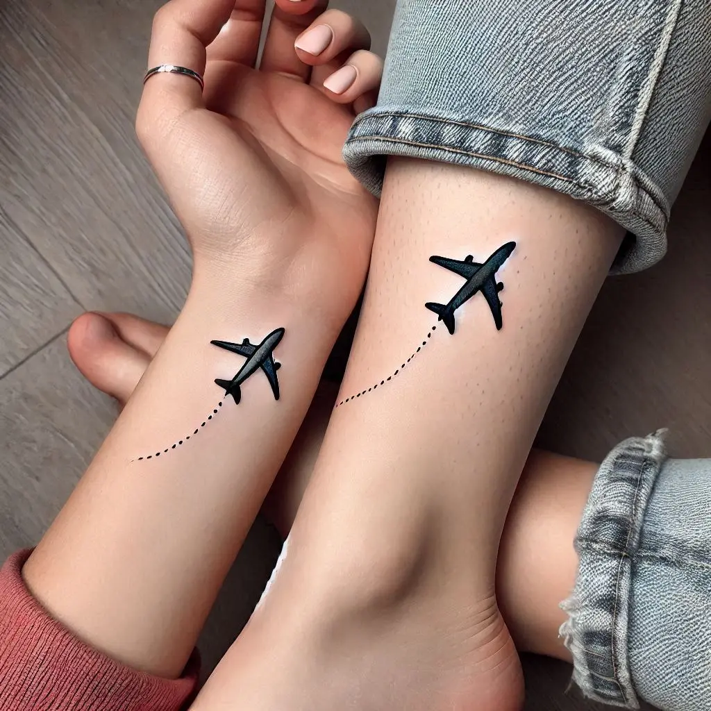 Tattoo Meaning: An airplane flying between the locations of both friends symbolizes your journeys to see one another and the excitement of reunion.