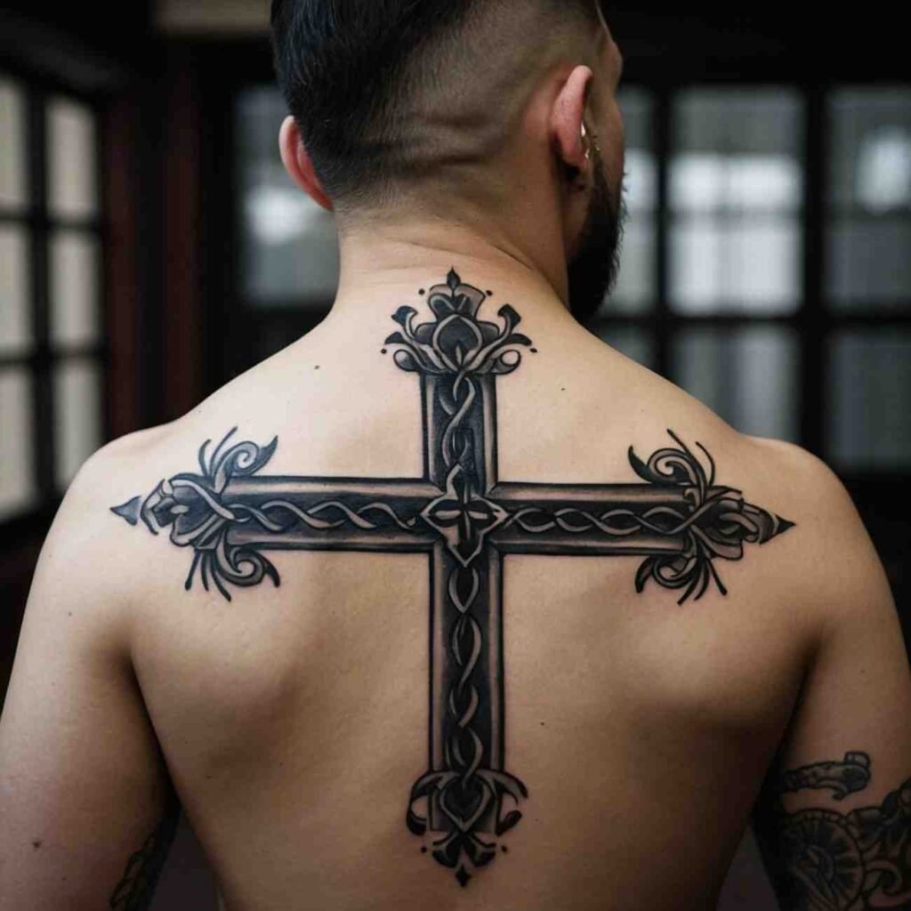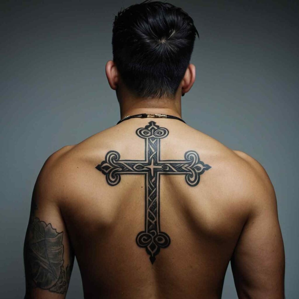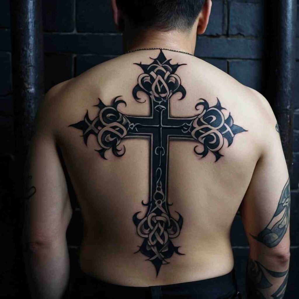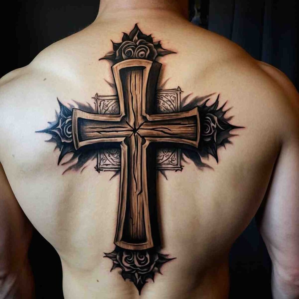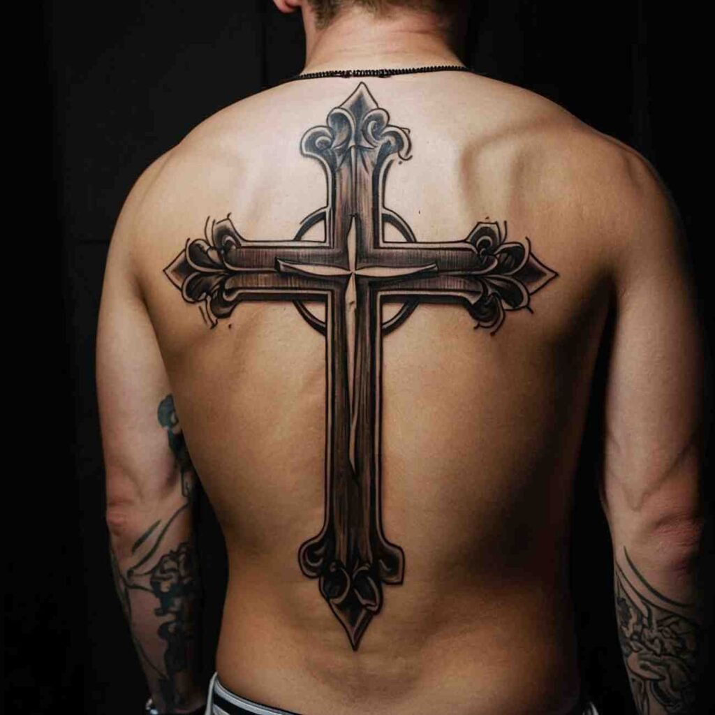 Let’s explore some incredible back cross tattoo designs for men that carry deep meaning.