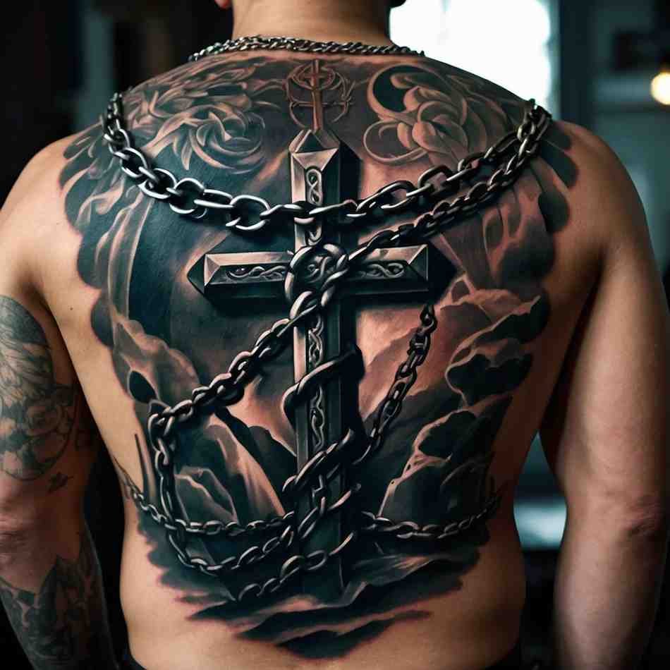 A cross tattoo wrapped in chains symbolizes breaking free from oppression or past struggles. This design often resonates with men who have overcome difficult times and want to represent their strength and resilience. The chains can be broken or wrapped tightly around the cross, depending on the message you want to convey. This back tattoo has a deep, personal meaning and visually symbolizes strength, freedom, and perseverance.