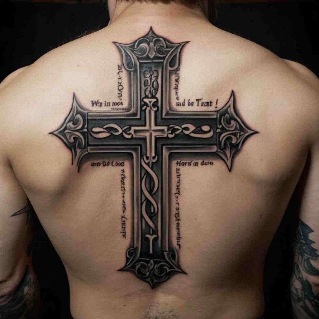 For men who want their faith to be clearly understood, a cross tattoo paired with a Bible verse or religious quote is a powerful choice. The cross is often placed in the center of the back, while the scripture wraps around it or is inked above or below the cross. This design allows for personal customization, as you can choose verses that have specific meaning to your life. It’s an ideal design for those who find strength in the words of their faith.