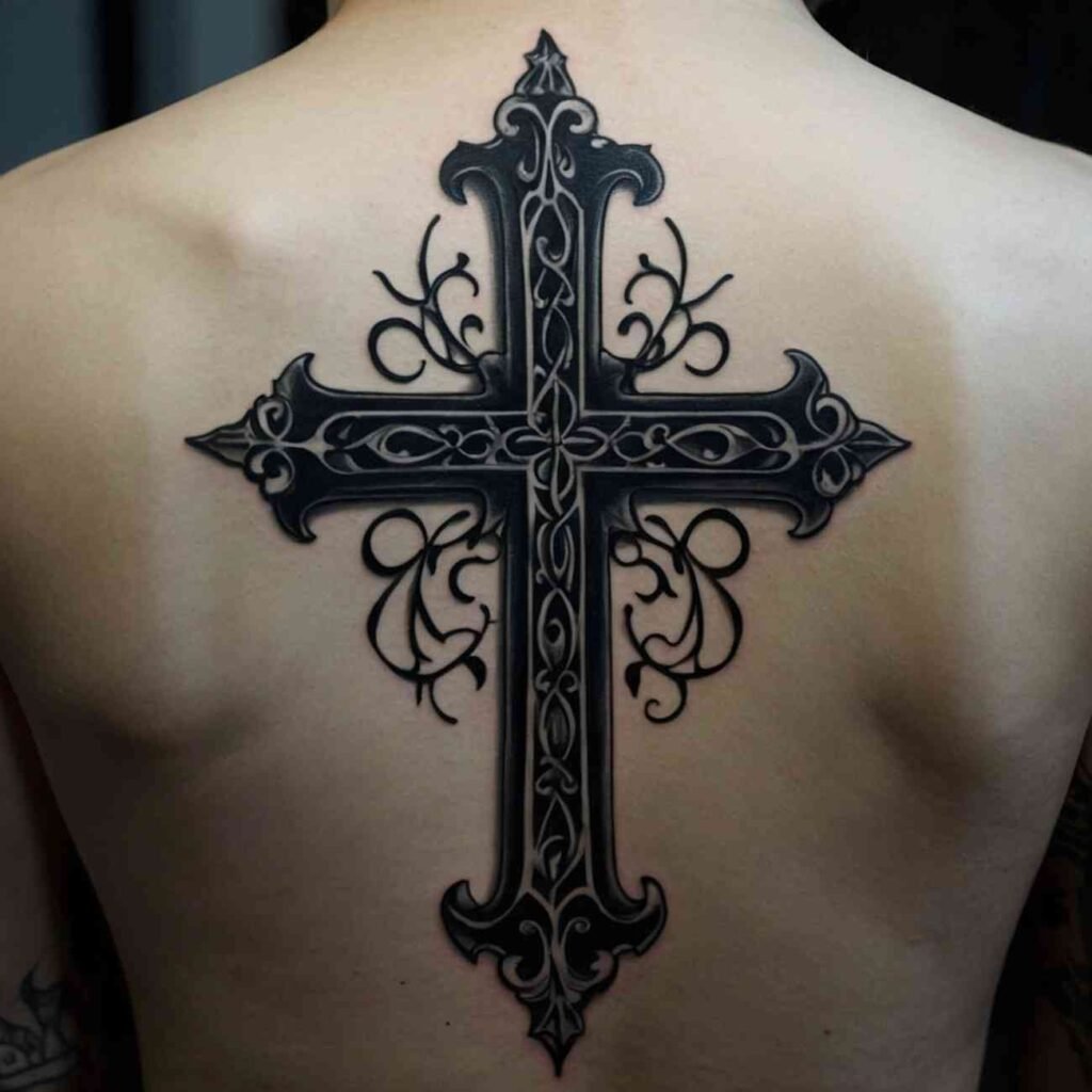 A gothic cross design is usually more ornate, featuring darker and more dramatic elements like sharp edges, iron bars, or thorny vines. For men who lean toward a more mysterious and edgy look, this design speaks to inner strength and resilience. The gothic style often blends medieval architecture with elements of spirituality, giving the tattoo an old-world feel. It’s perfect for men who want a large, bold back tattoo that is both artistic and symbolic of their strength and defiance.
