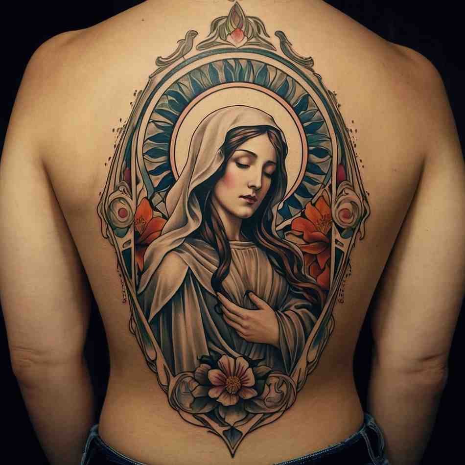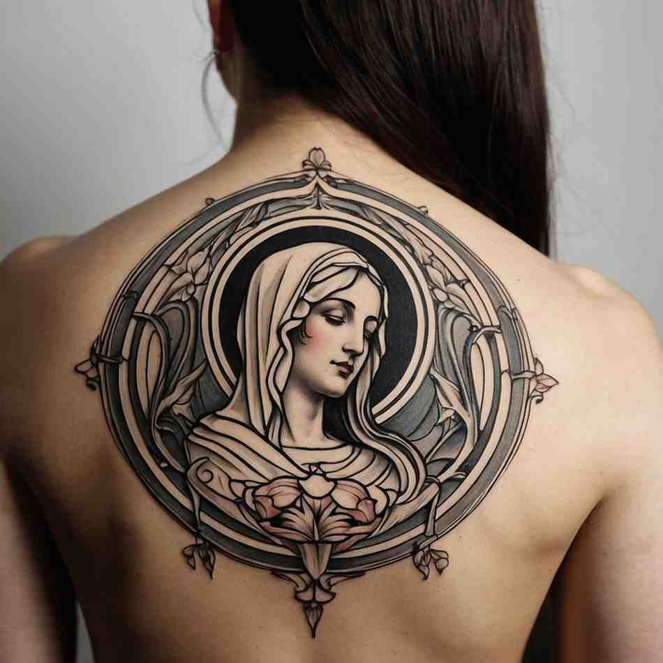 The Art Nouveau style adds a vintage touch to Mother Mary tattoos. This design features flowing lines and intricate details, creating a beautiful and timeless representation of her. It’s perfect for those who appreciate classic art.