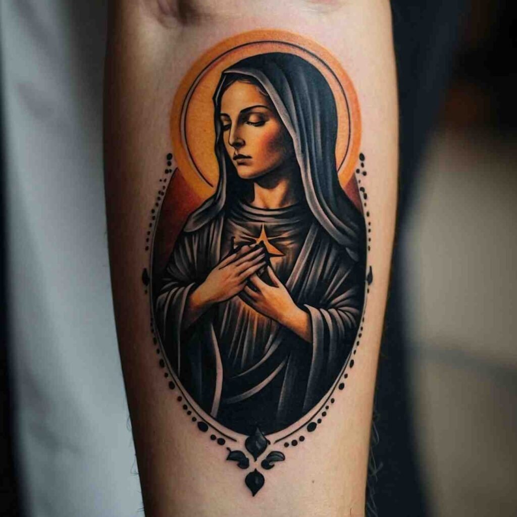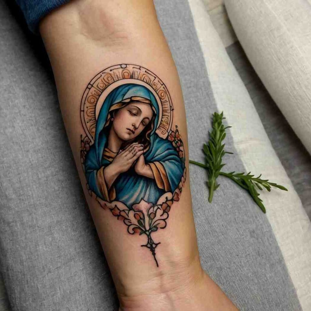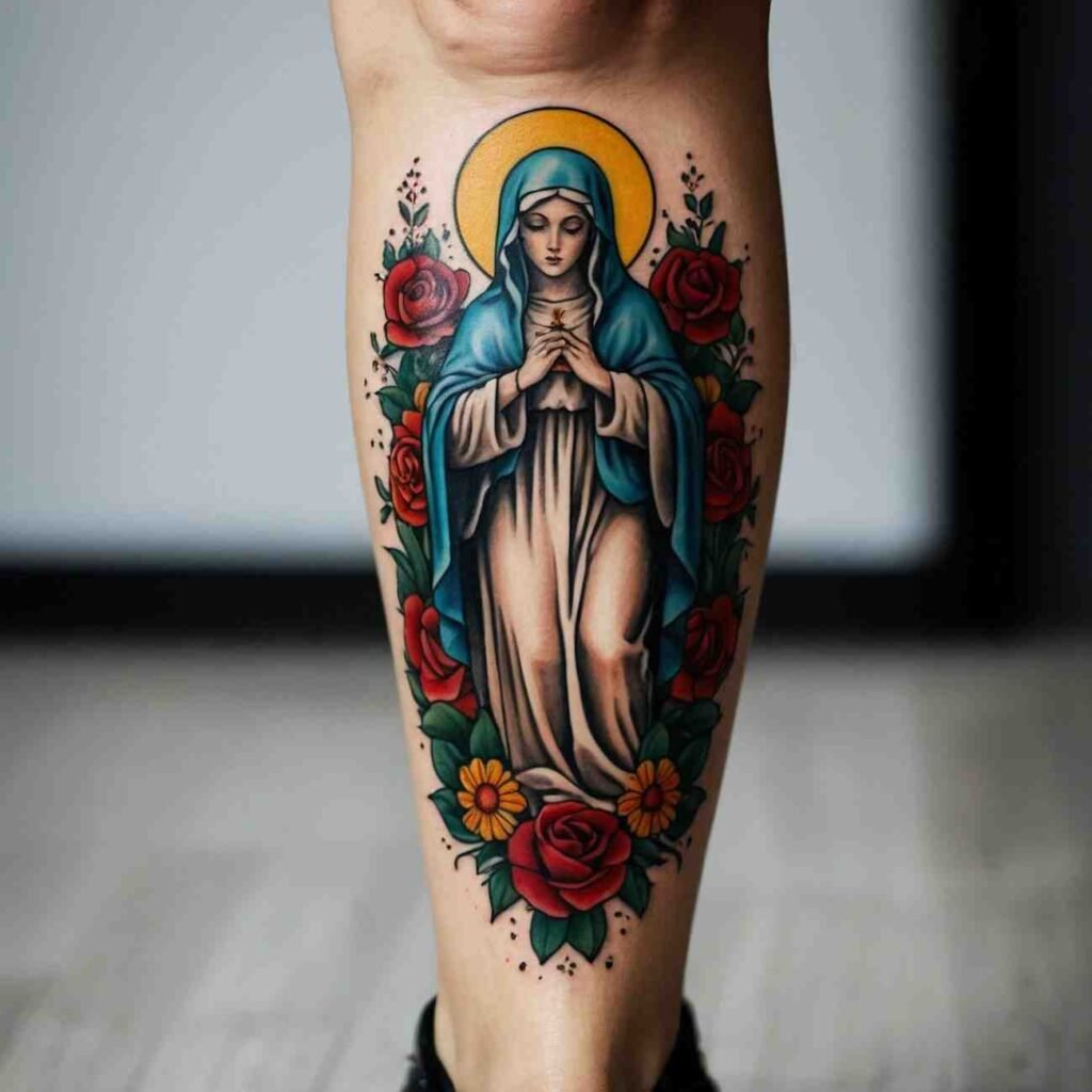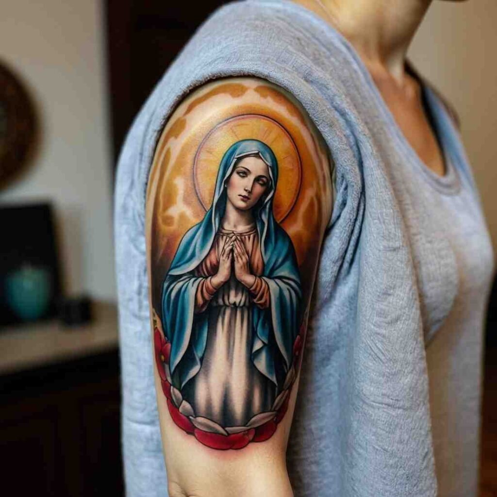 Adding sunflowers to the design symbolizes happiness and warmth. This tattoo reflects the joy and love that Mother Mary represents. It’s a bright and cheerful choice for those who want a positive representation of their faith.