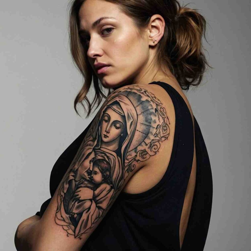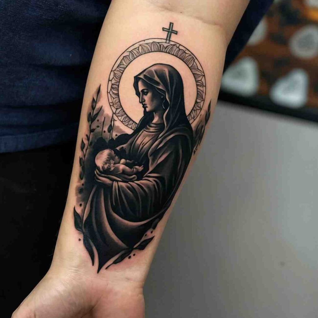 A beautiful portrayal of Mother Mary cradling Baby Jesus captures the essence of motherhood. This design represents love, protection, and the bond between a mother and child. It’s perfect for those who want to showcase their faith and maternal instincts. This tattoo can be personalized with additional elements like flowers or stars for extra meaning.