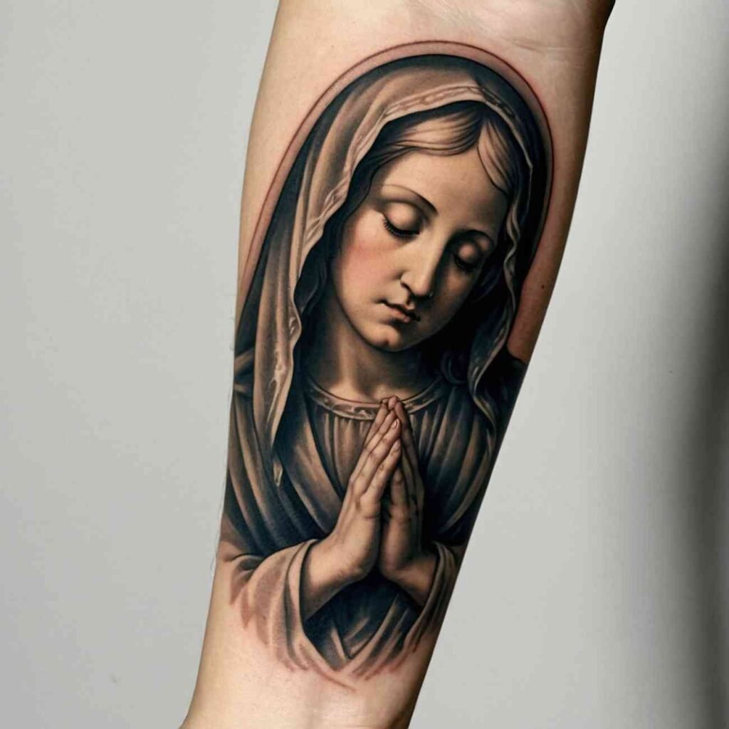 This tattoo design features Mother Mary in a prayerful pose, symbolizing faith and devotion. It’s a powerful reminder to stay grounded and connected to one’s beliefs. Many people choose this design to express their commitment to their faith and the importance of prayer in their lives.
