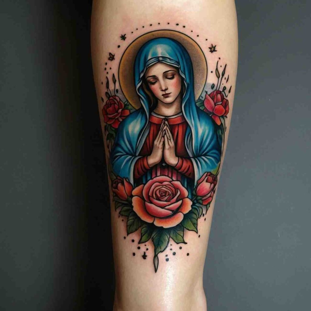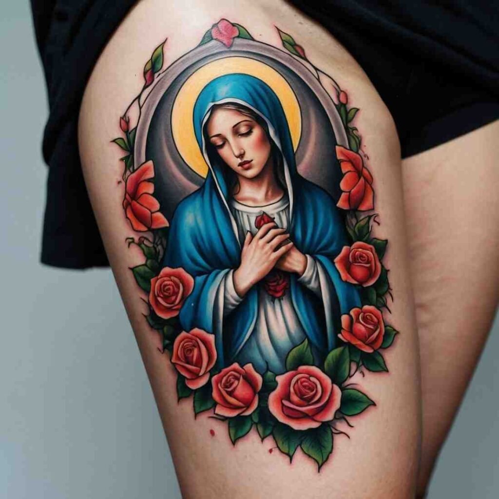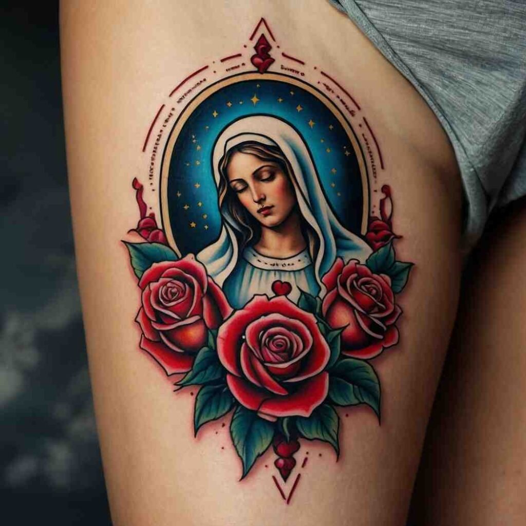 Incorporating roses into the design adds a layer of beauty and meaning. Roses symbolize love, making this tattoo a perfect choice for those who wish to express their deep affection for Mother Mary. The combination of flowers and her image creates a stunning visual that tells a story of love and devotion.