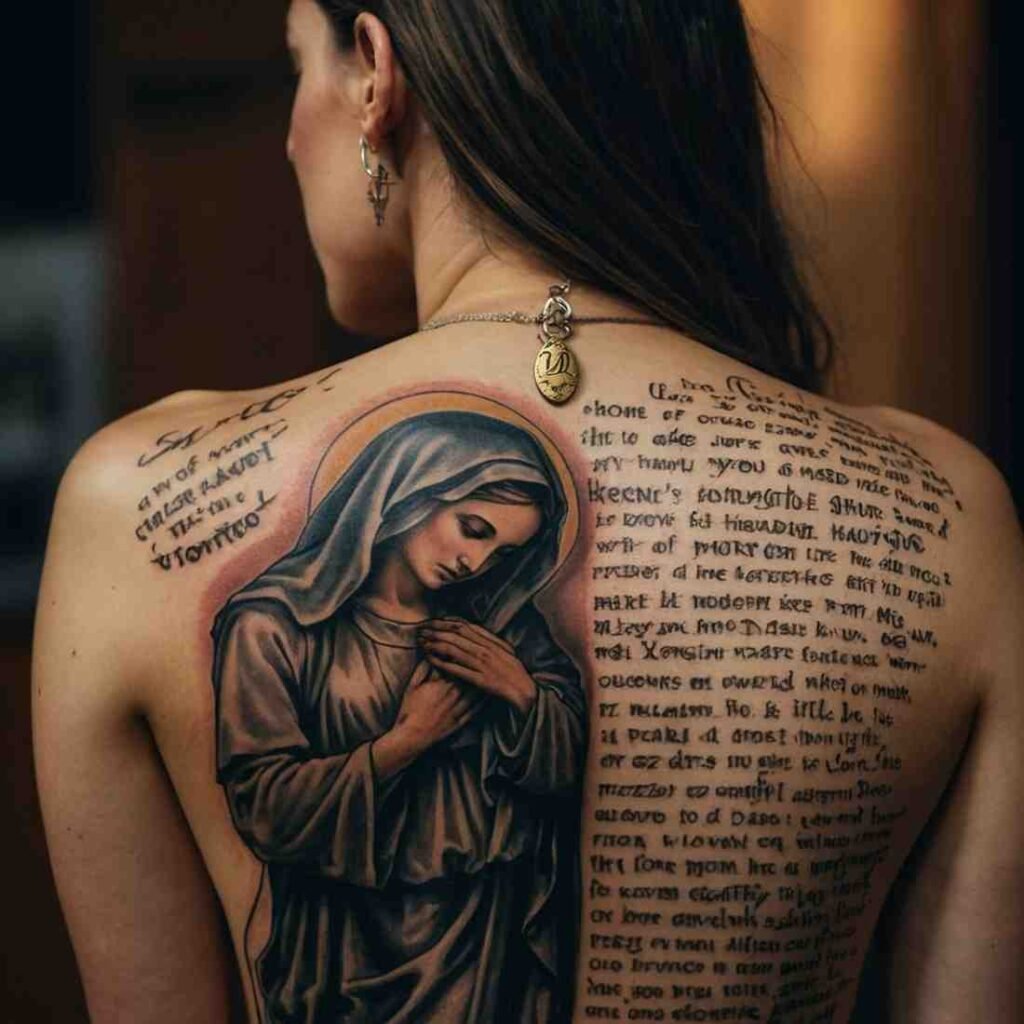 Incorporating a meaningful quote alongside Mother Mary adds a personal touch. It could be a verse from the Bible or a phrase that resonates with your beliefs. This tattoo design combines visual art with words to convey a powerful message.