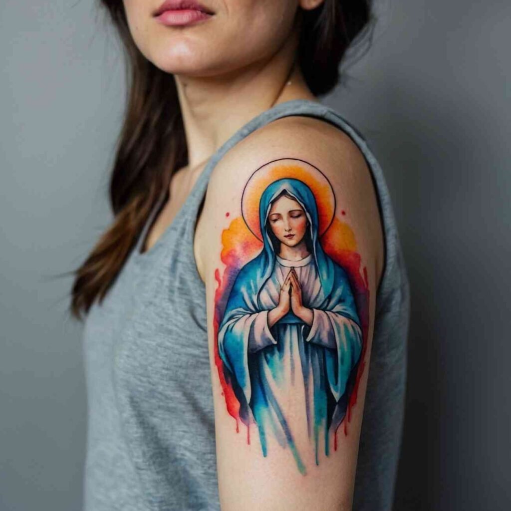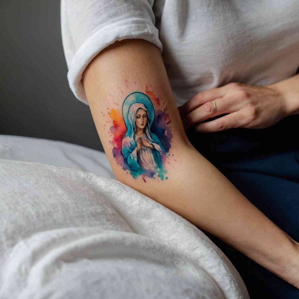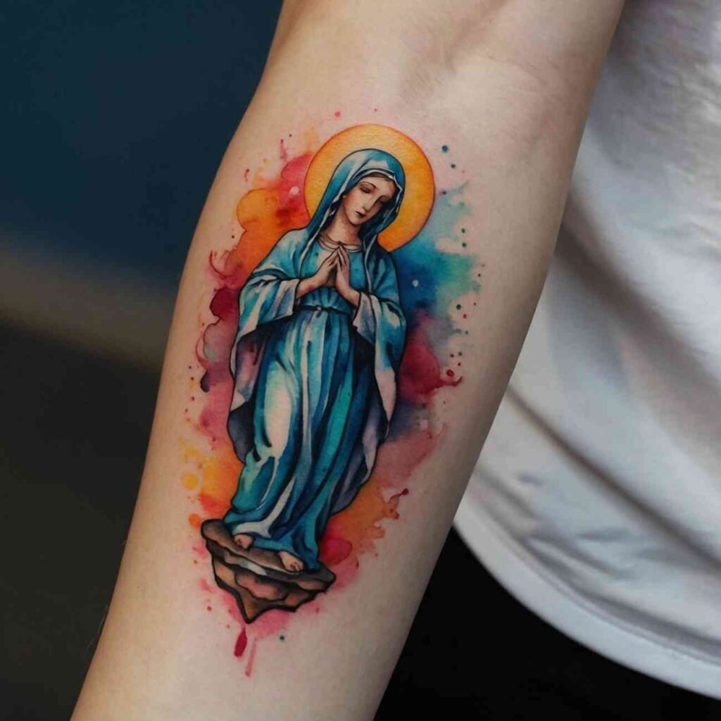 The watercolor style adds a modern twist to traditional Mother Mary tattoos. With vibrant colors and soft edges, this design represents the beauty and fluidity of faith. It’s perfect for those who want a unique and artistic representation of their beliefs.