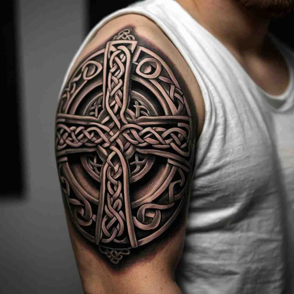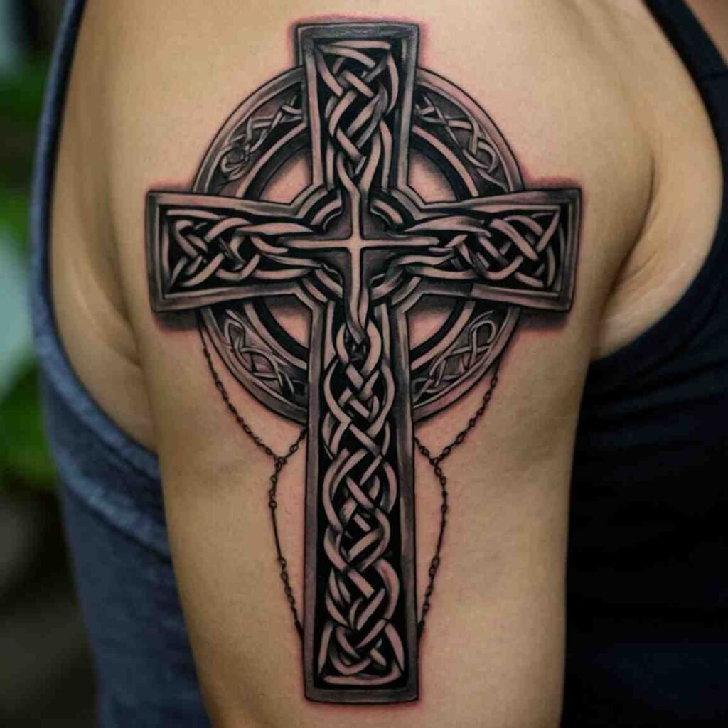 The Celtic cross combines the Christian cross with a circle, symbolizing God’s eternal love. This design is often associated with Irish Catholic heritage and represents both faith and unity. A Celtic cross tattoo can be detailed with intricate knotwork, adding depth and beauty to the piece.