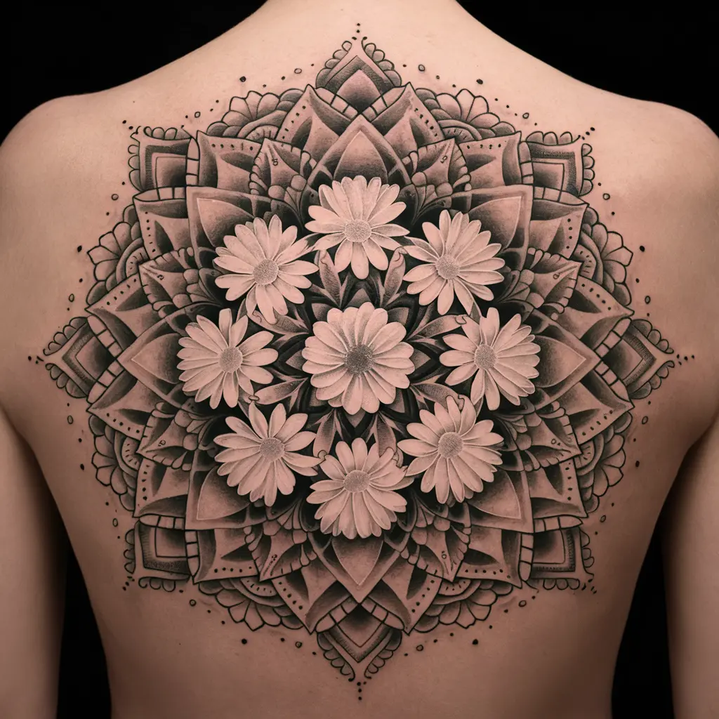 Tattoo Meaning: A mandala represents harmony, unity, and spiritual balance. When paired with the daisy, it also signifies new beginnings and purity.