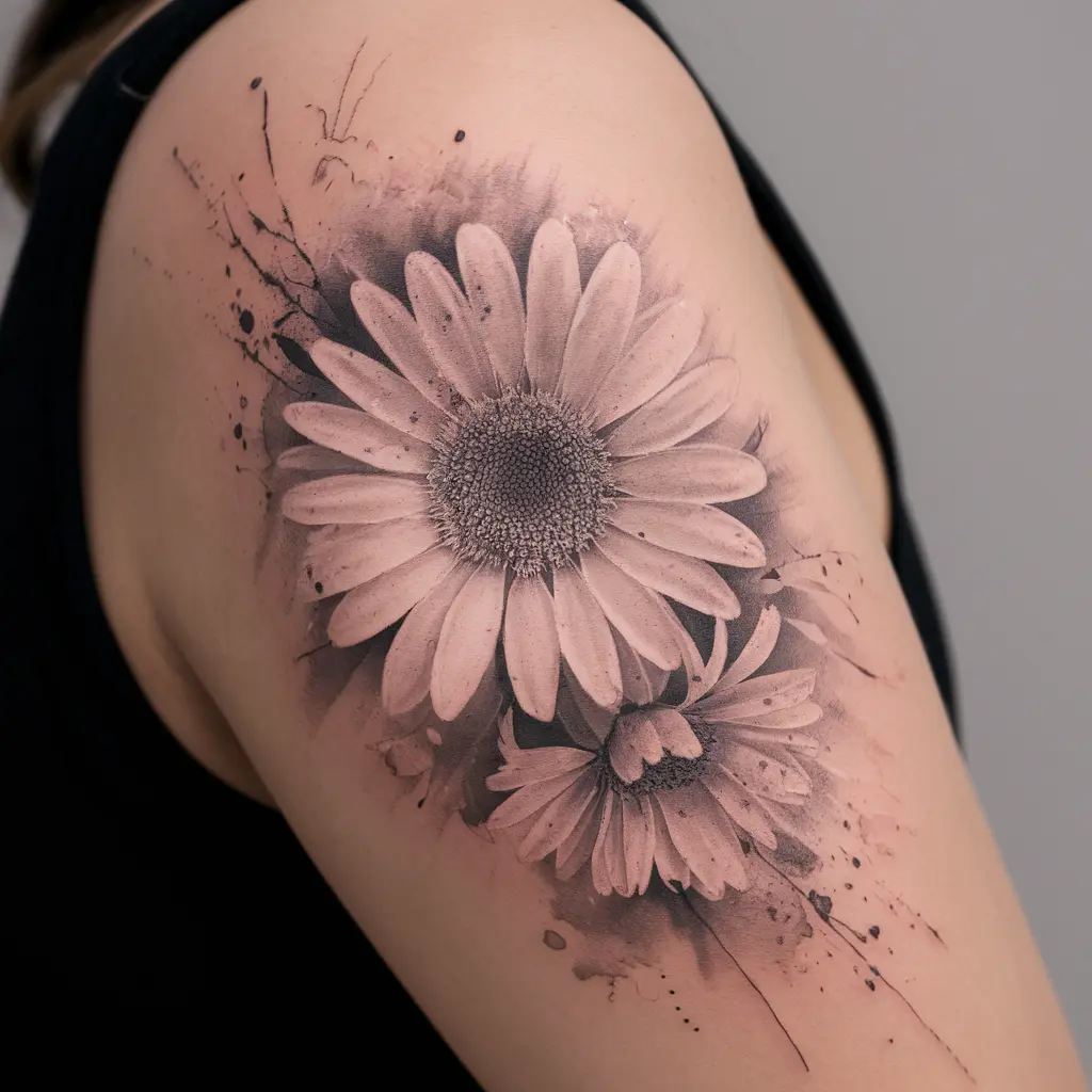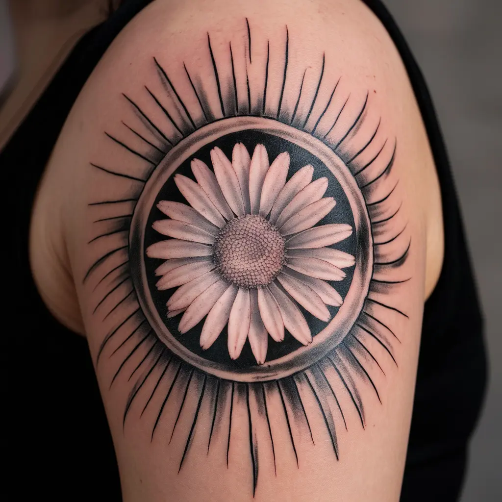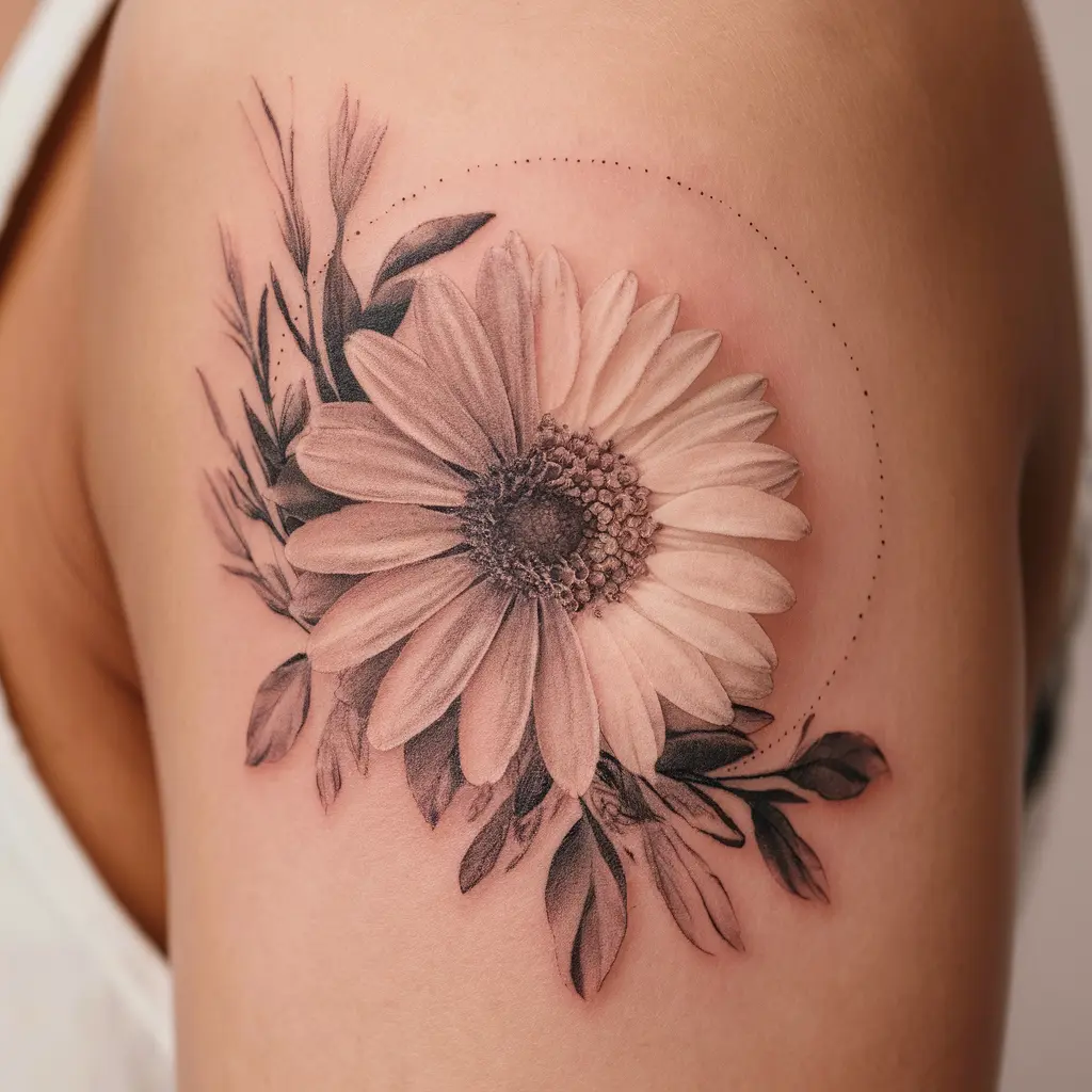 A half-daisy tattoo on the shoulder is a soft, feminine design. The daisy appears as if it’s gently blooming from the skin, giving it a natural, organic look.