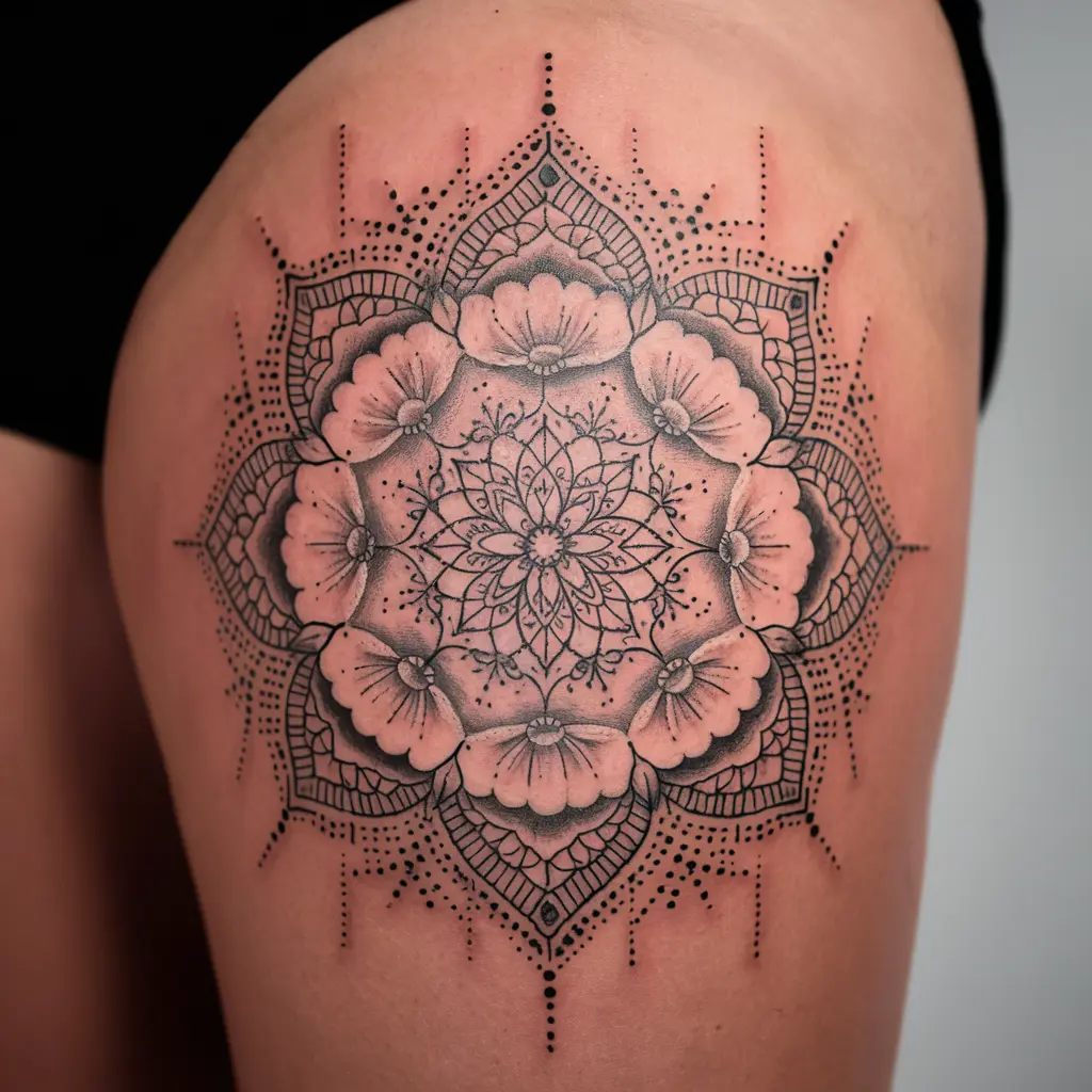 Tattoo Meaning: Cosmos flowers are often associated with peace and harmony. The mandala, in turn, represents wholeness and unity.