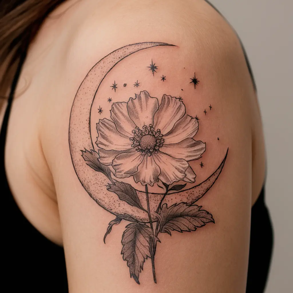 The combination of a cosmos flower and a crescent moon is perfect for those who love celestial designs. The cosmos represents peace, and the moon adds a calming, otherworldly touch.