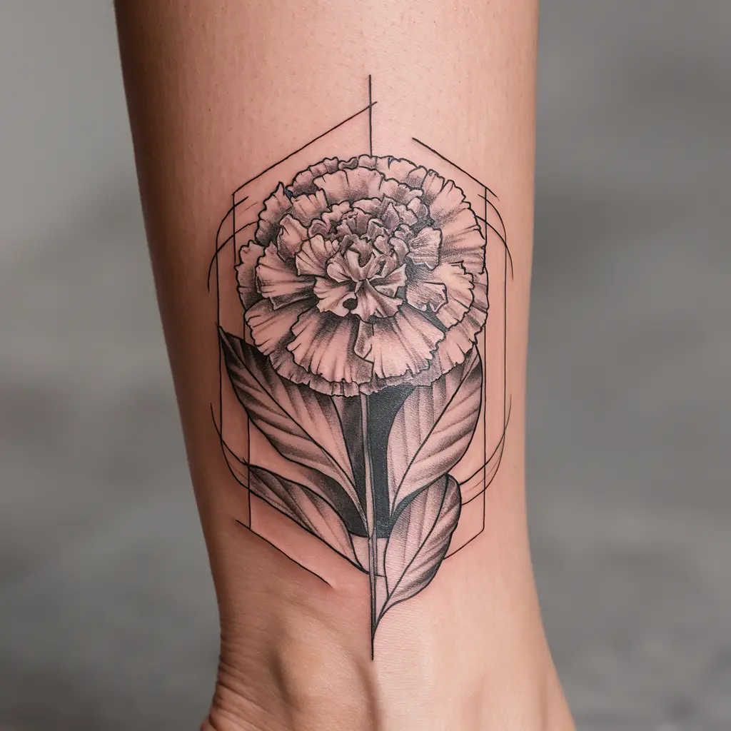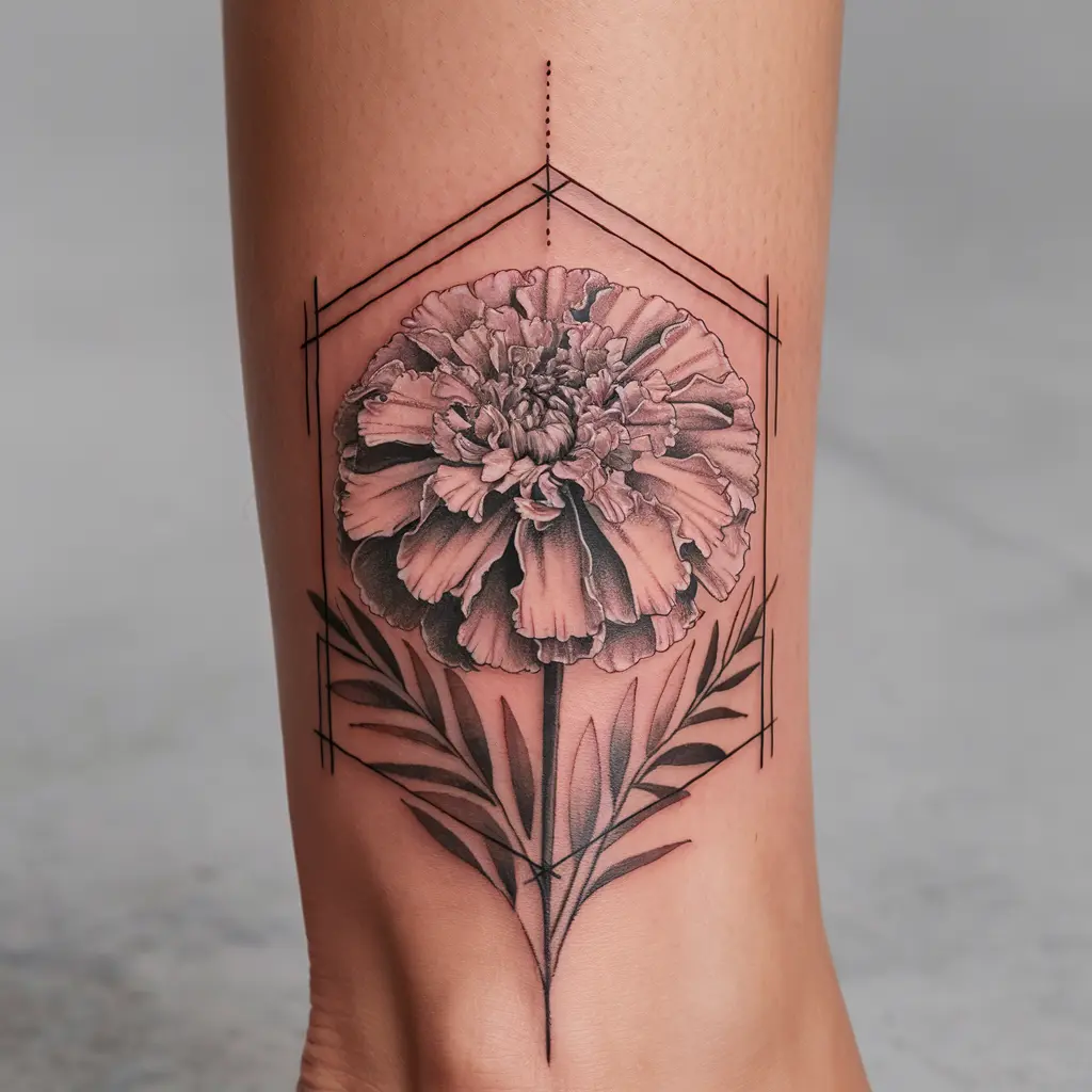 Tattoo Meaning: The marigold represents creativity, and the geometric shapes represent structure, creating a balance between the two.