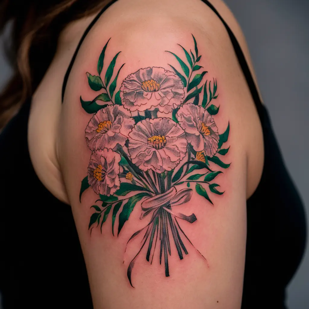 Tattoo Meaning: A bouquet symbolizes abundance, while marigolds emphasize the beauty of life, creativity, and warmth.
