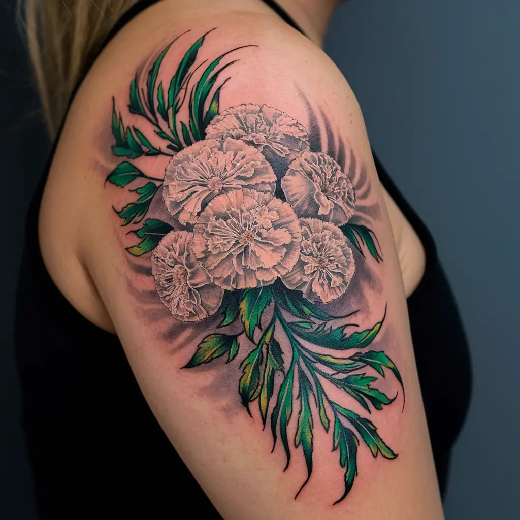 A full bouquet of marigolds creates a stunning, colorful tattoo. This design celebrates the warmth and creativity that marigolds represent.