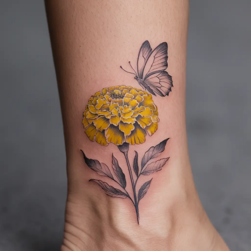 Tattoo Meaning: The marigold symbolizes creativity, and the butterfly represents transformation, making this tattoo a beautiful symbol of growth and change.