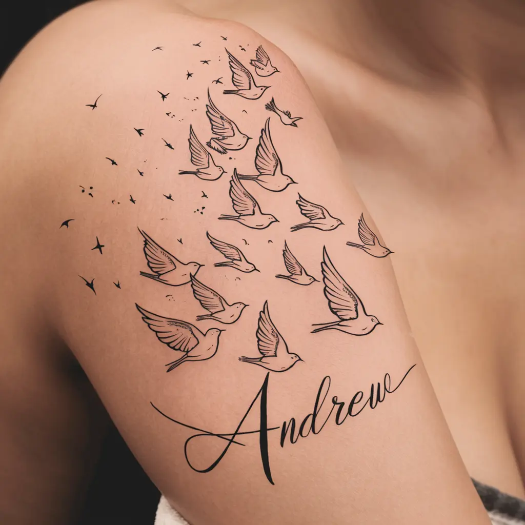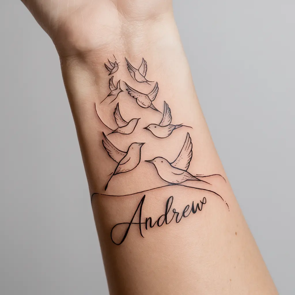 Andrew’s name surrounded by small birds flying upward, creating a sense of movement.