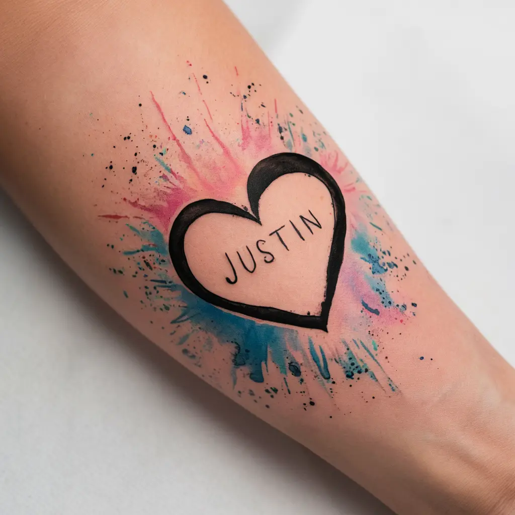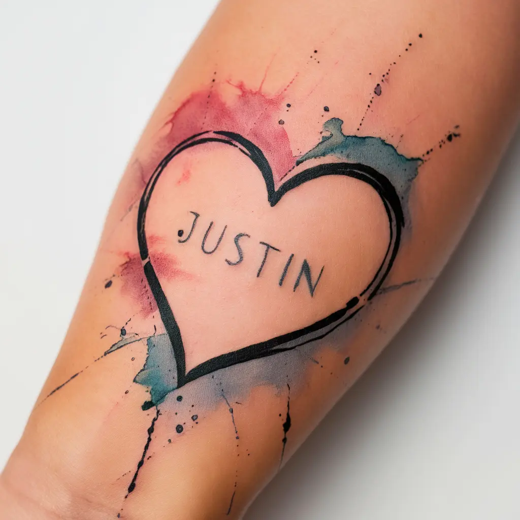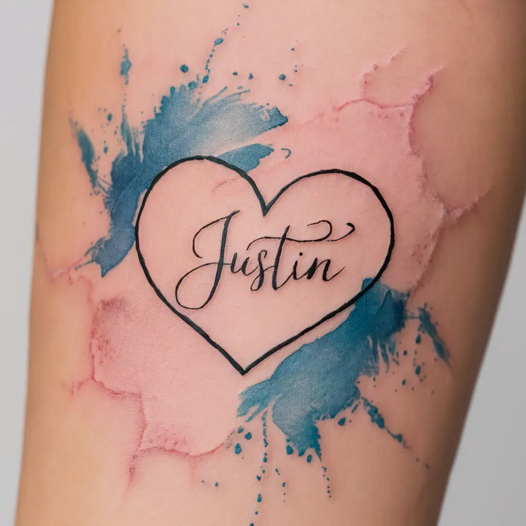 “Justin” is written inside a heart with soft watercolor splashes in the background.