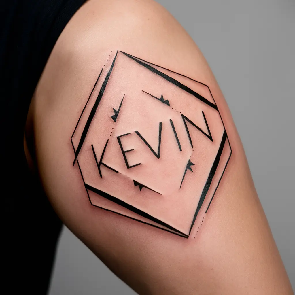 “Kevin” is creatively woven into a geometric pattern, such as a hexagon or triangle design.