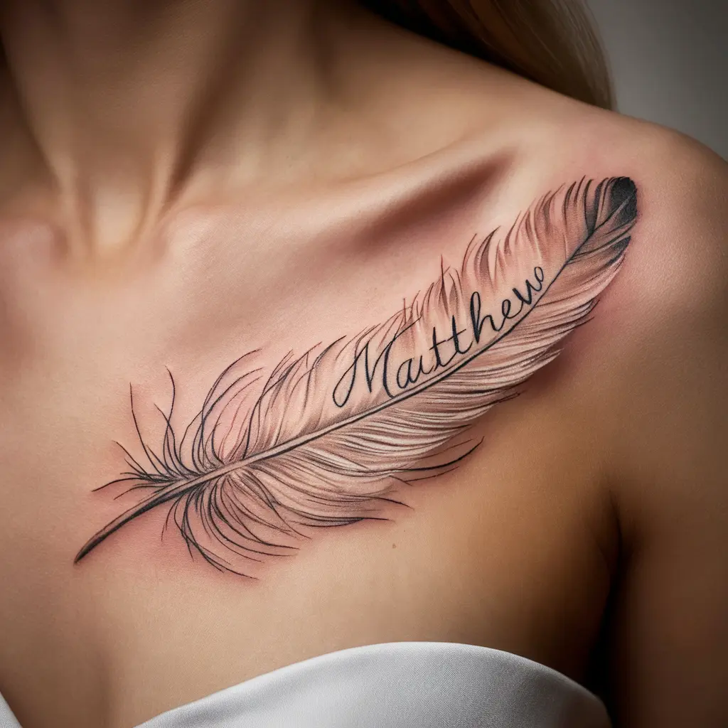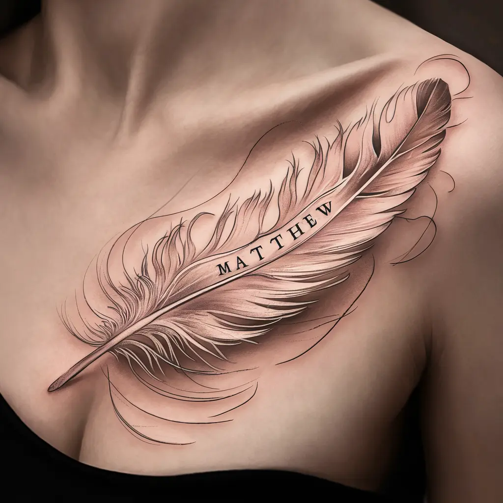 Matthew’s name written delicately along a feather, creating a soft and artistic design.