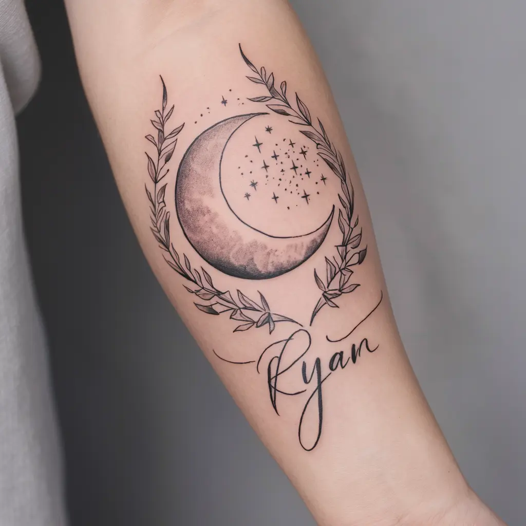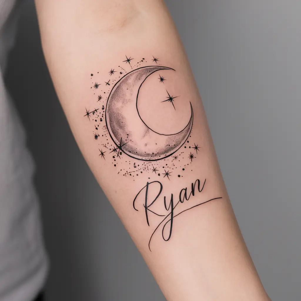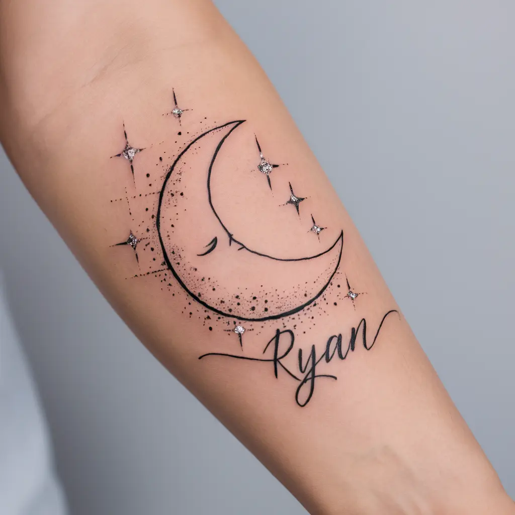 “Ryan” nestled under a crescent moon with small stars dotting the sky around it.