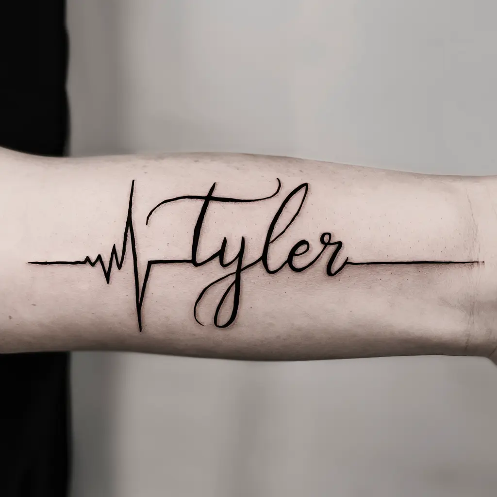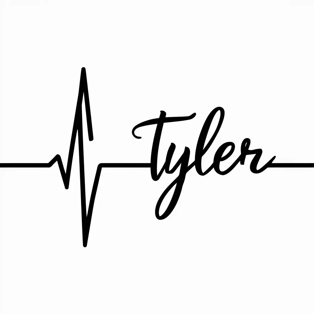 A heartbeat line with “Tyler” written along its curve, creating a simple yet meaningful design.