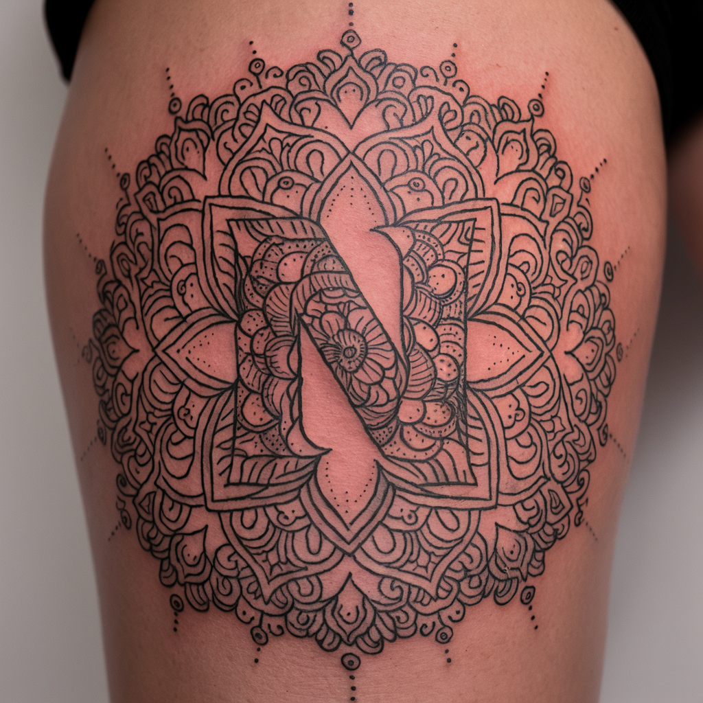 Mandalas are symbols of balance, unity, and eternity. A mandala-inspired “N” is an intricate, circular design surrounding or blending with the letter.