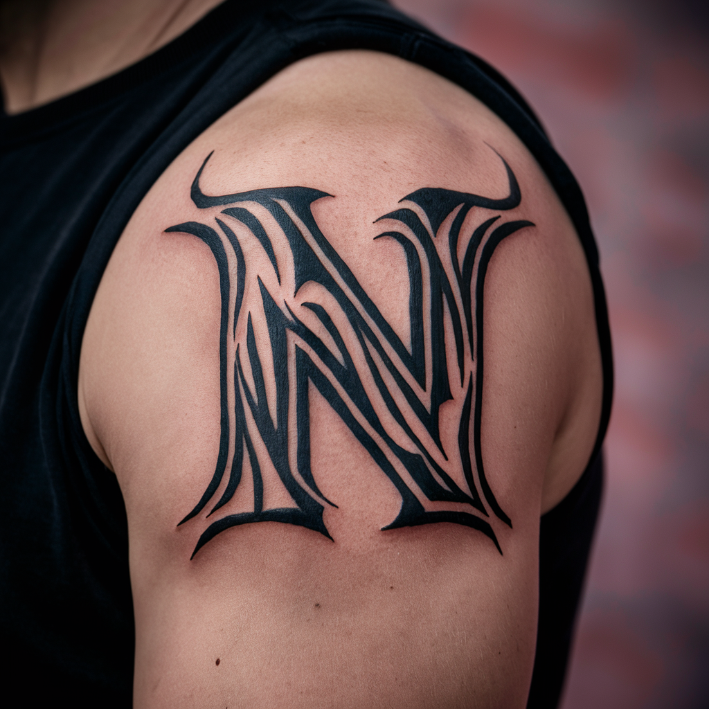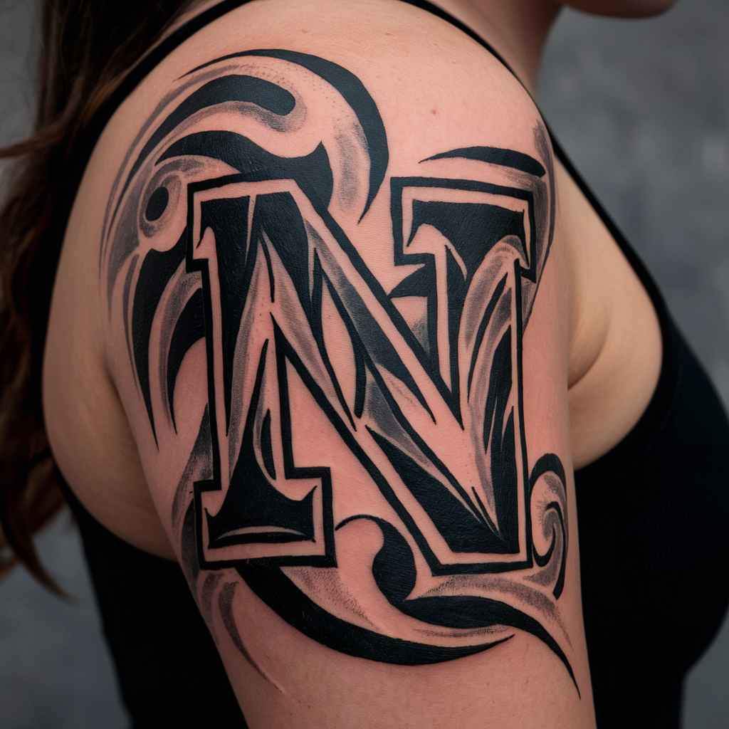 Tribal tattoos have roots in ancient cultures and often carry rich stories. A tribal “N” is a bold, intricate design that features swirling lines, dots, and sharp curves, giving it a strong, powerful appearance.