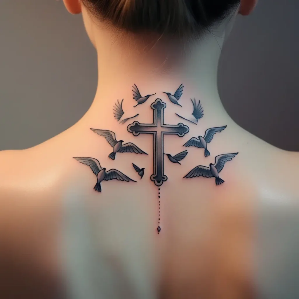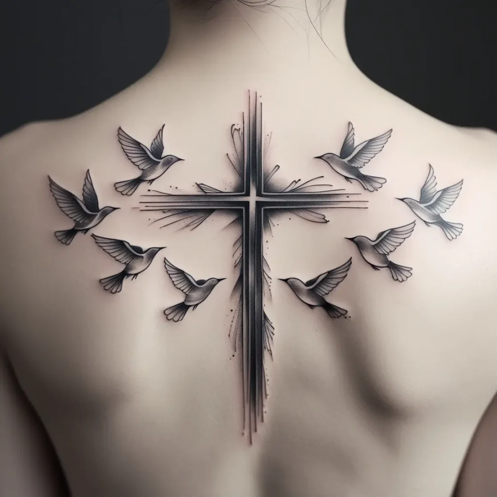 This tattoo features birds flying in a V formation around the cross. The V shape symbolizes unity, and the birds show how we can all follow the same spiritual path.
