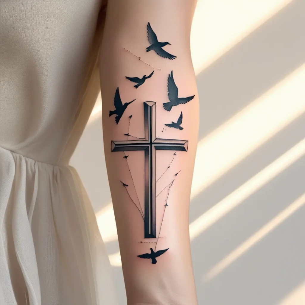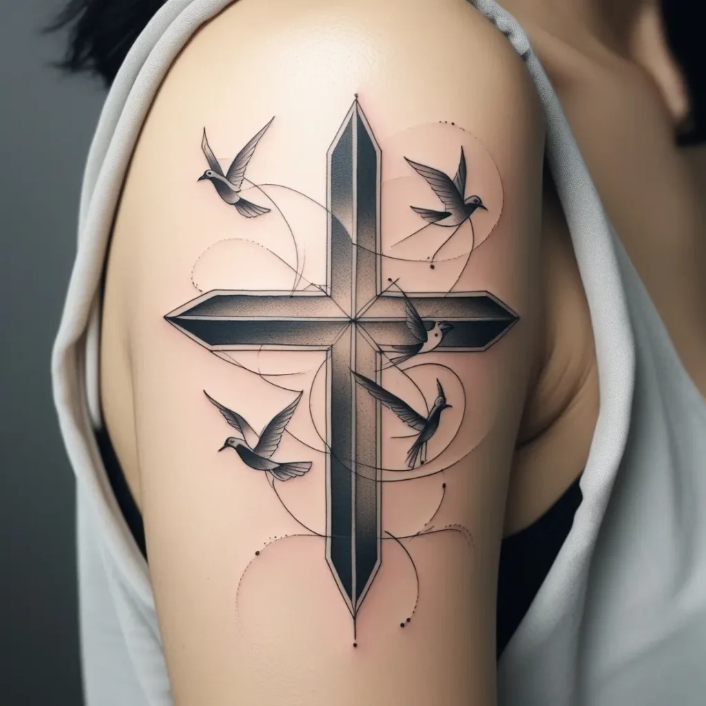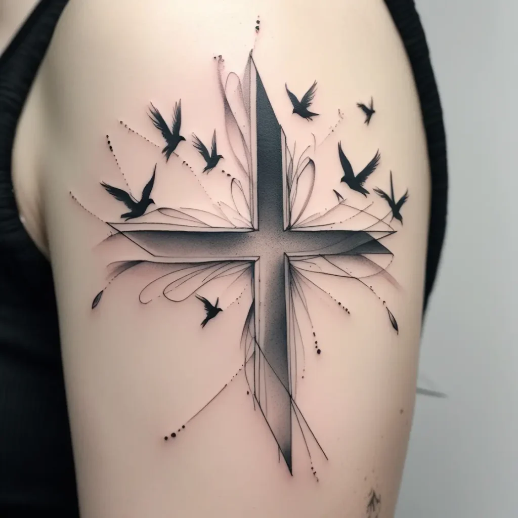A modern take on the classic cross design, this tattoo includes geometric patterns for the cross, with abstract birds flying off its edges. The sharp lines and angles represent structure, while the birds symbolize freedom.