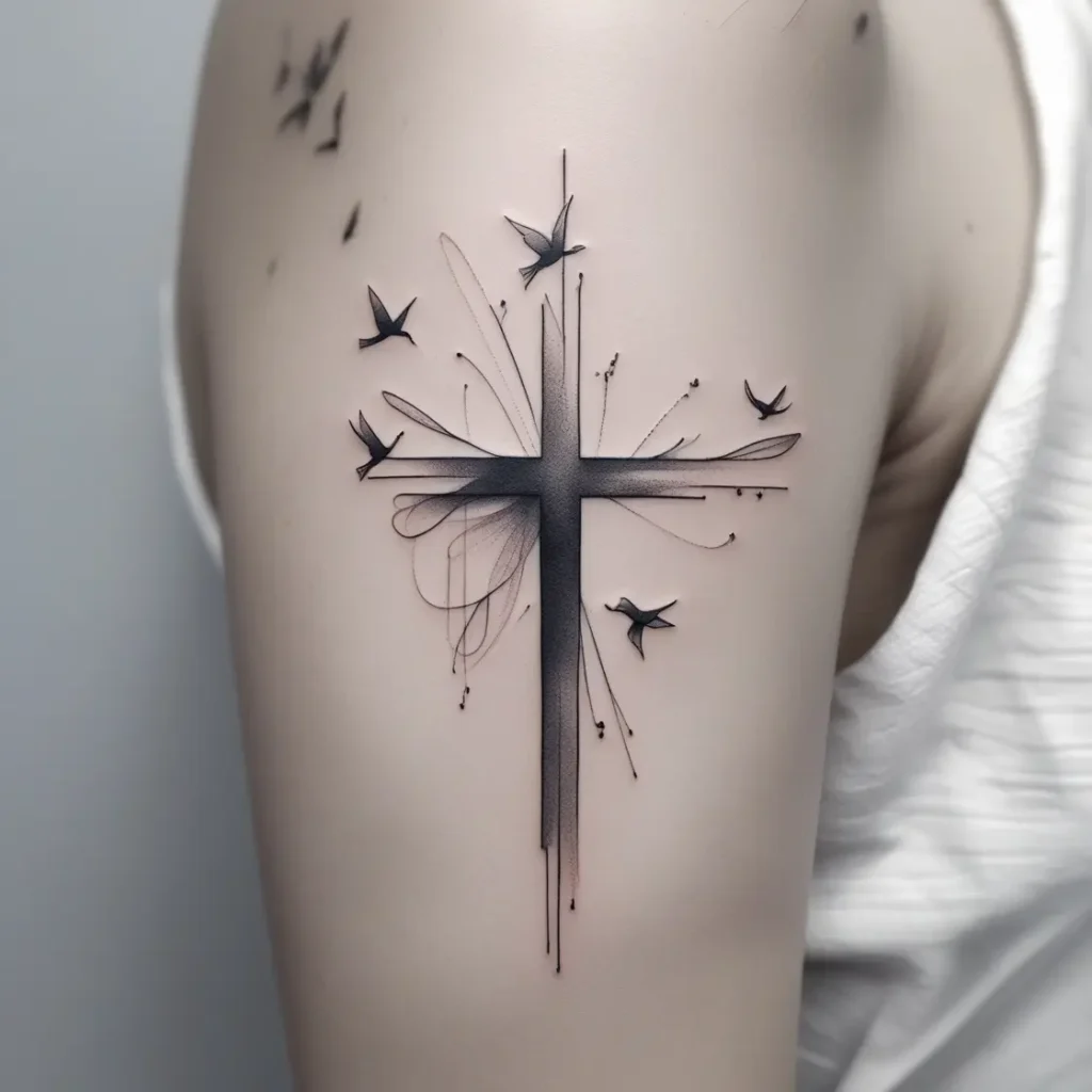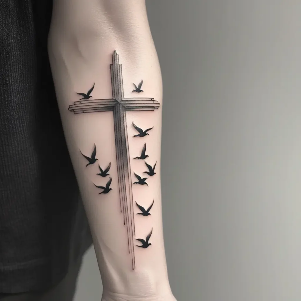 A minimalist tattoo design where the cross is paired with the simple silhouettes of birds flying away. The clean lines give the tattoo an elegant, timeless look.