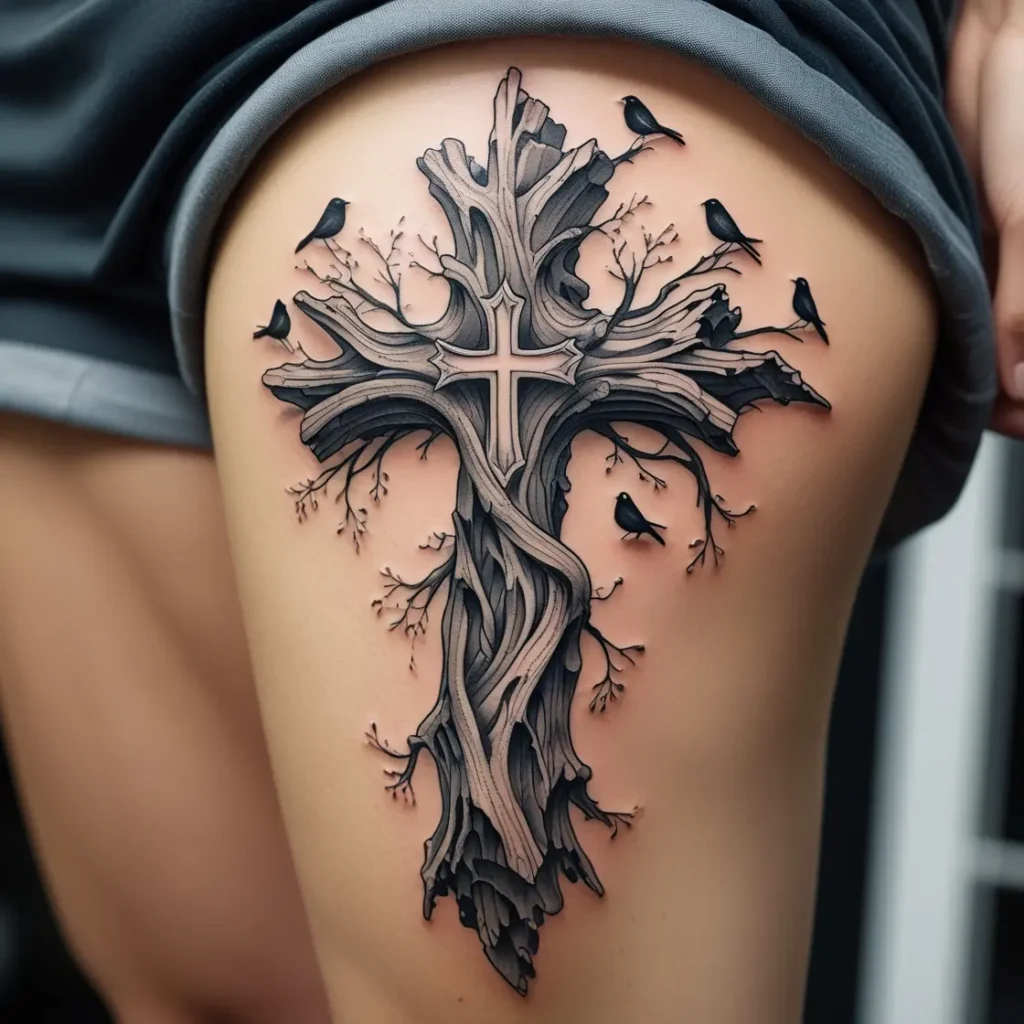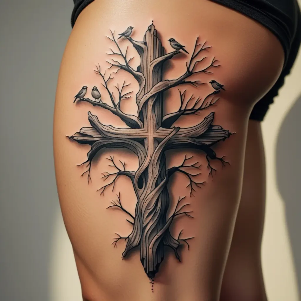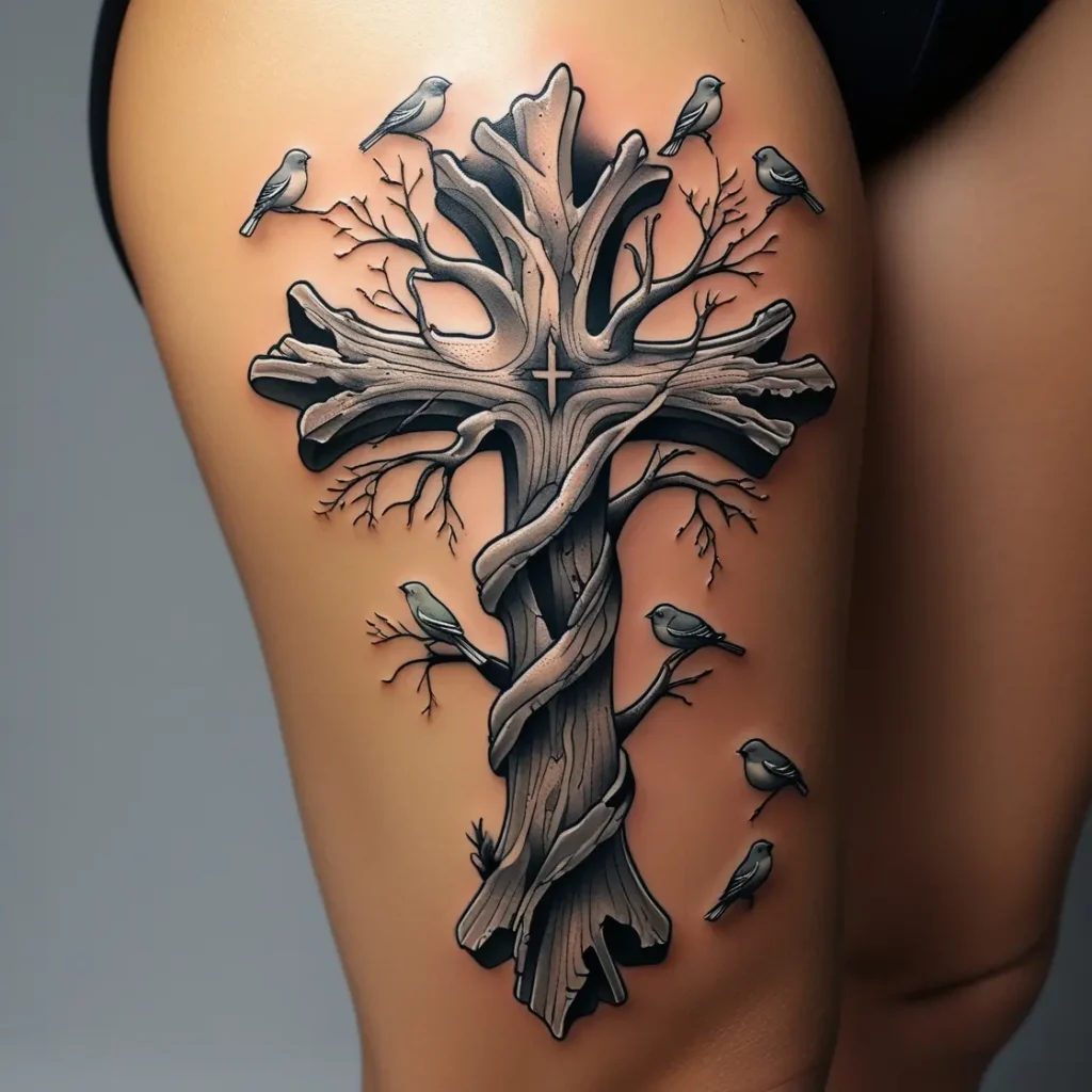 Imagine a cross that looks like a tree trunk, with birds perched on its branches. This design symbolizes life, growth, and the connection between nature and spirituality.
