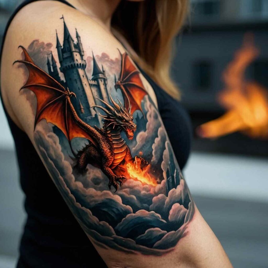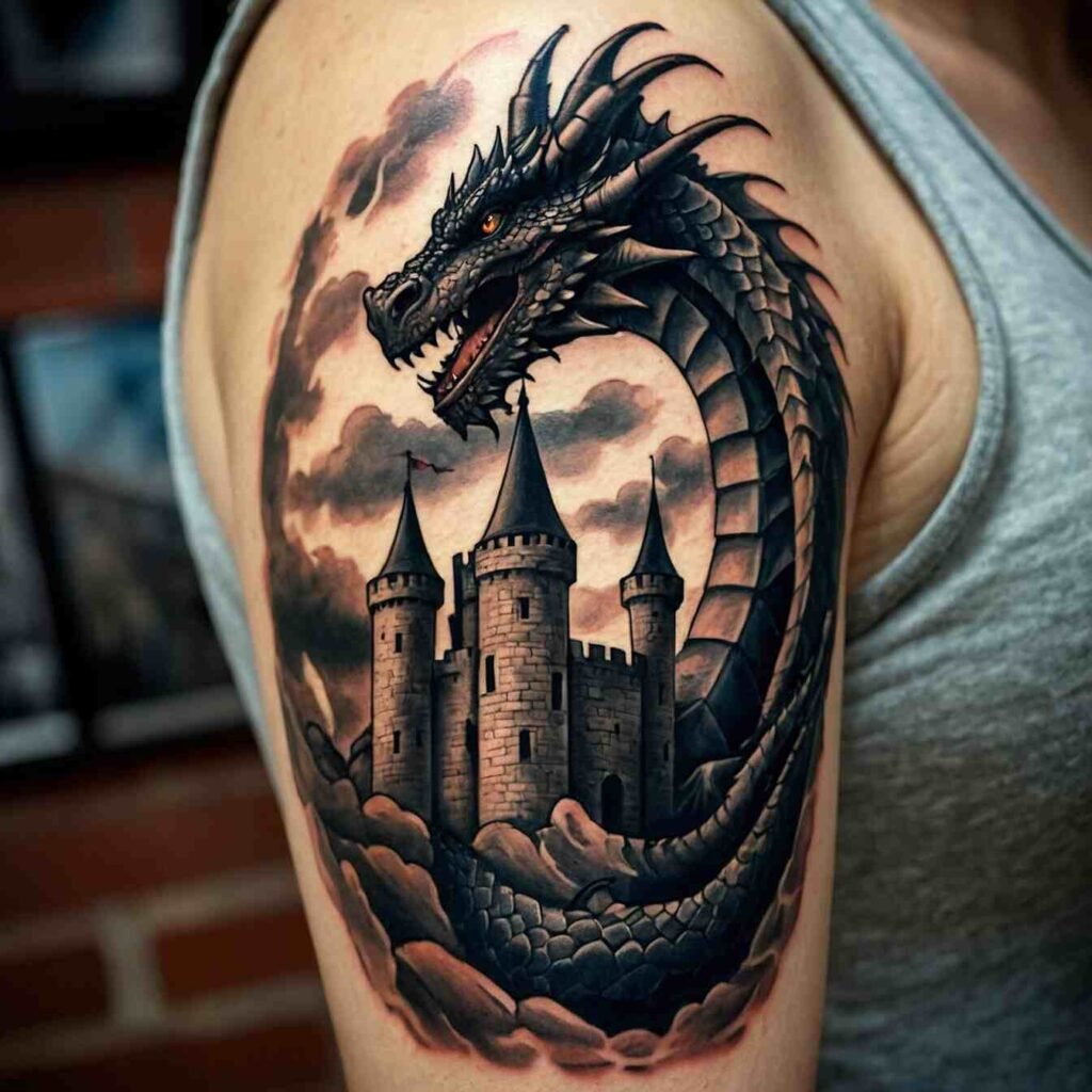 A dragon and castle symbolize power and legend. This tattoo is perfect for someone who loves mythological tales and the strength of legendary creatures. It’s a powerful choice for those who appreciate the dramatic imagery of dragons and the timeless allure of castles.