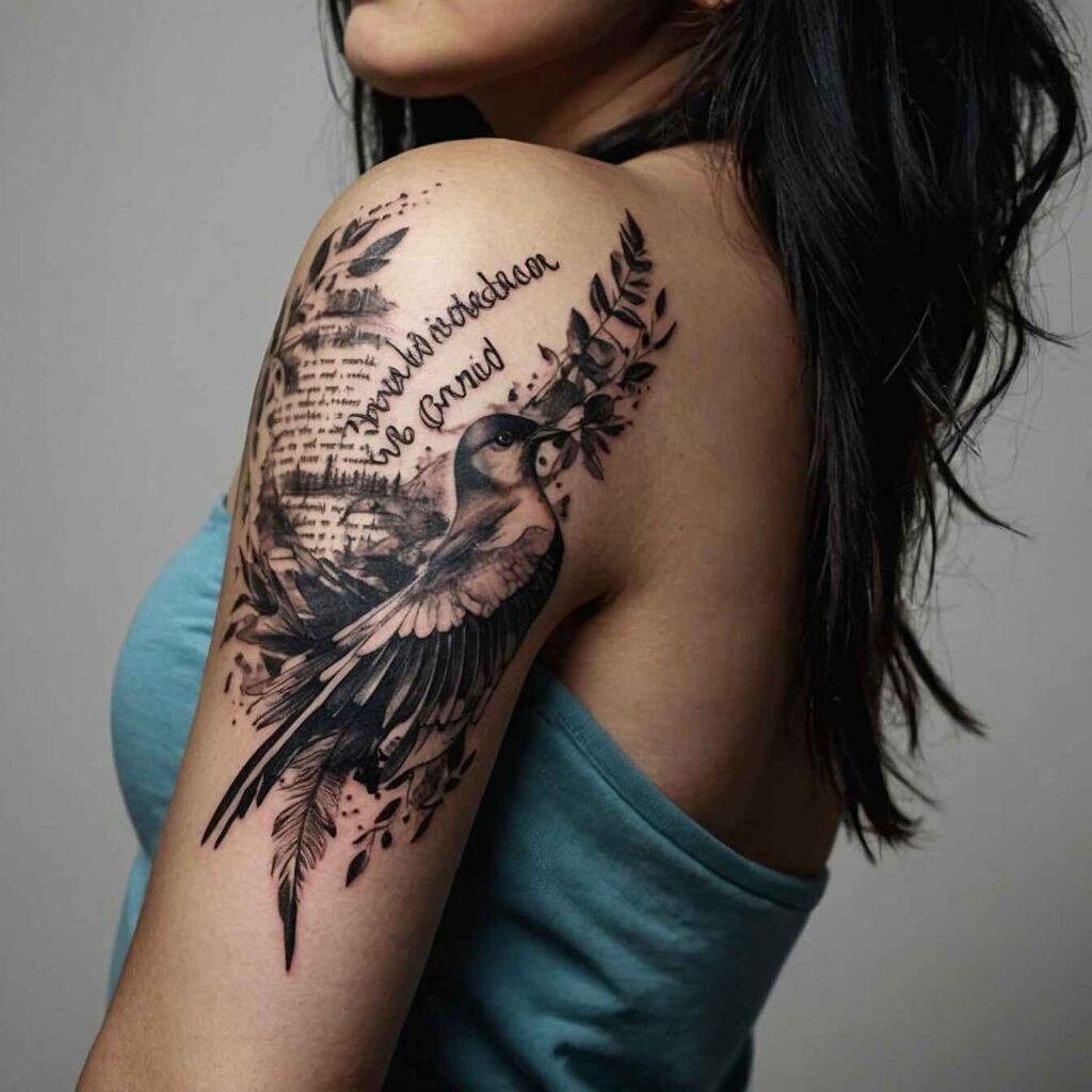 A quote and bird symbolize freedom and inspiration. This tattoo is perfect for someone who values uplifting words and the beauty of flight. It’s an inspiring choice for those who appreciate the combination of meaningful quotes and the graceful imagery of a bird in flight.