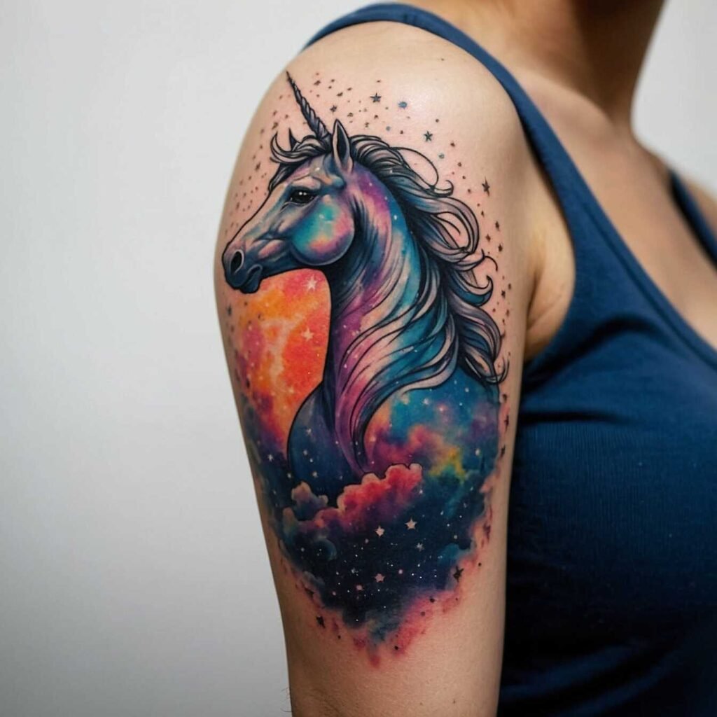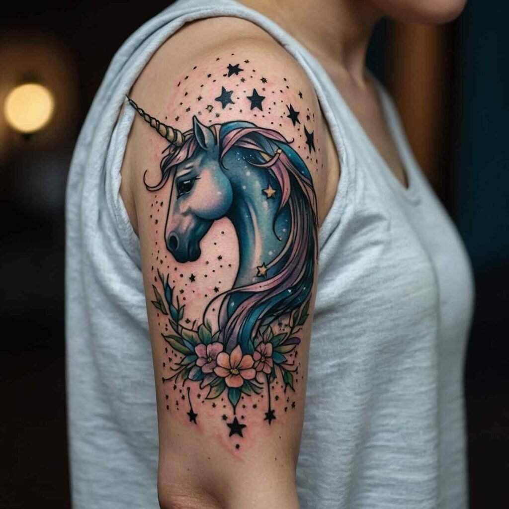 A unicorn and stars represent purity and dreams. This tattoo is ideal for someone who values innocence and the power of imagination. It’s a dreamy choice for those who appreciate the mythical beauty of unicorns and the wonder of a starry sky.