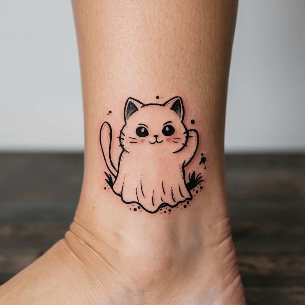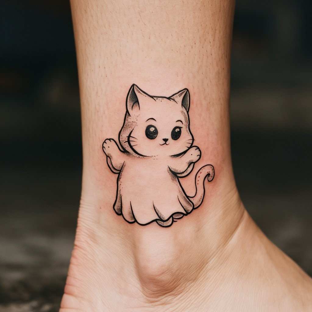 If you love both ghosts and cats, why not combine them? A mini ghost cat tattoo is both cute and mysterious. It symbolizes independence, curiosity, and the unknown, much like a real cat’s personality. This design is perfect for cat lovers who also enjoy a touch of spooky charm. You can place it on your ankle, wrist, or behind the ear for a subtle yet unique tattoo.