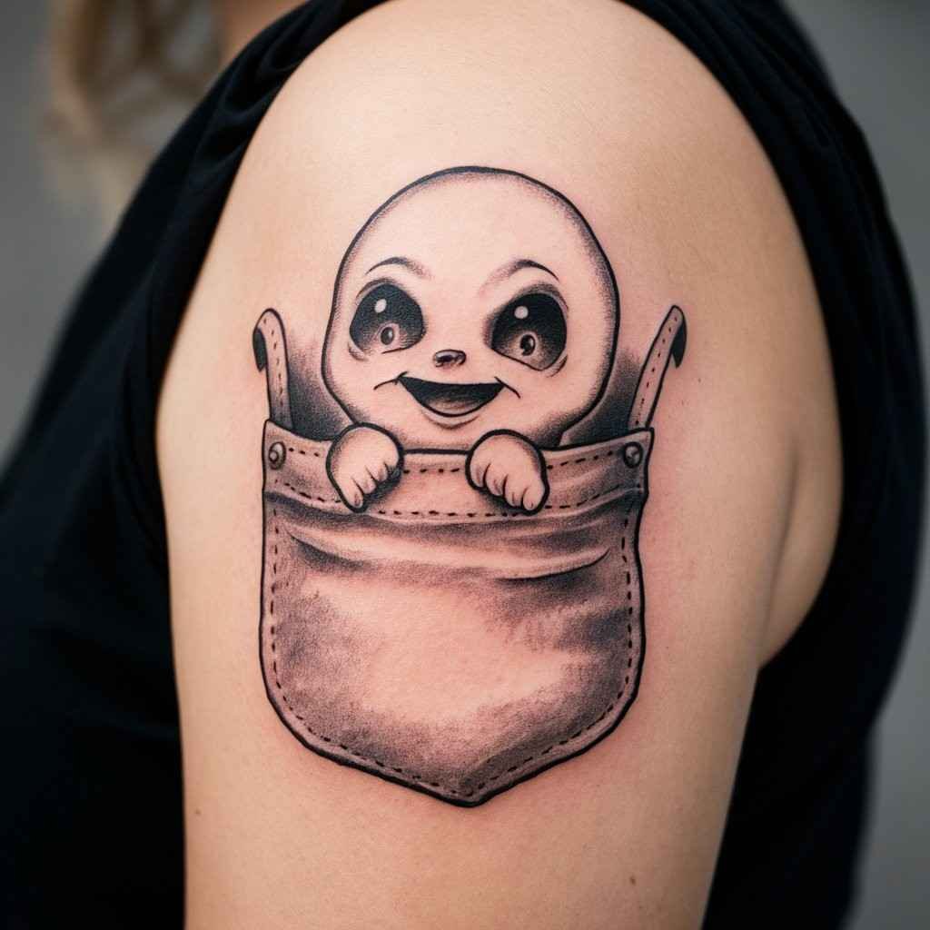 This playful design shows a mini ghost peeking out from a drawn-on pocket. It’s a cute and quirky tattoo that symbolizes curiosity and fun. This tattoo is ideal for someone who enjoys lighthearted designs and wants something that makes them smile. You can place it on your arm or chest, where it looks like the ghost is hiding in your shirt pocket, giving it a fun and interactive vibe.