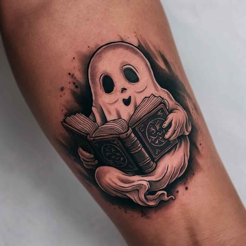 A ghost reading a book represents knowledge in the unknown or learning from mysterious sources. It’s a great tattoo for book lovers or anyone who believes in the power of education, even in the face of uncertainty. The design is small but detailed, with the ghost holding an open book. This tattoo fits well on the forearm, wrist, or even the back of the neck for a thoughtful piece of ink.