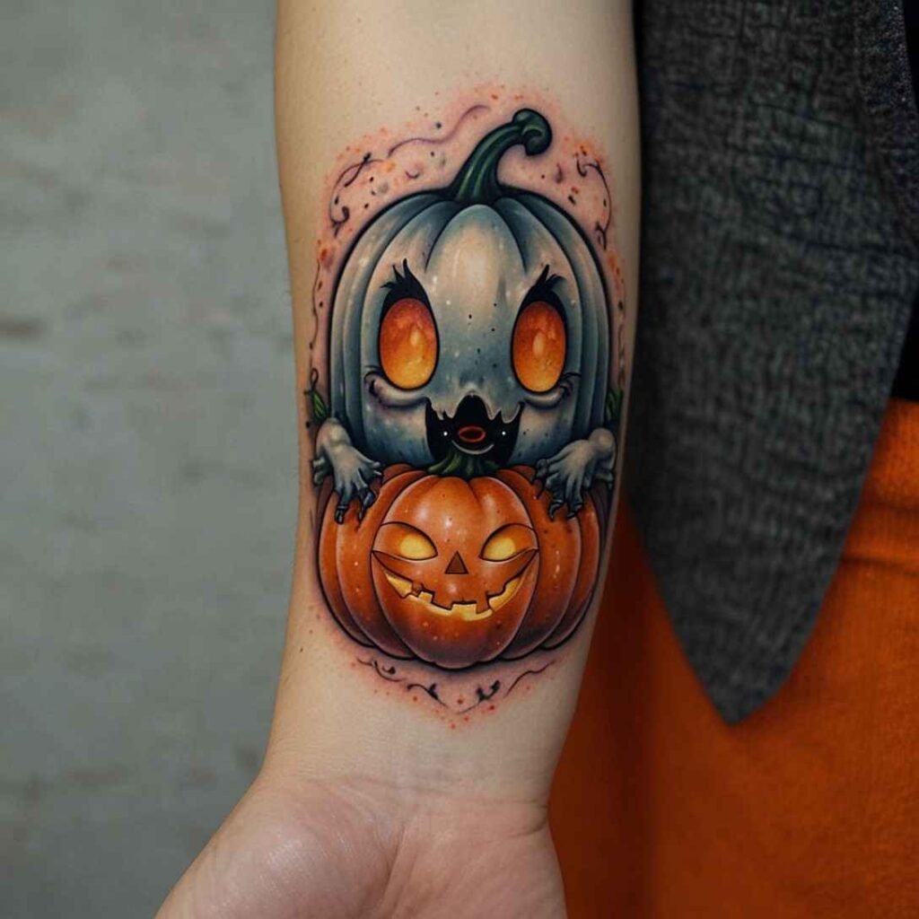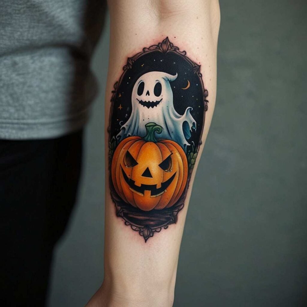 A ghost with a pumpkin is a classic Halloween pairing. It symbolizes the spooky season and is perfect for those who love October vibes all year round. The pumpkin adds a festive touch, while the ghost represents the fun and mystery of Halloween. This tattoo looks great on the arm or shoulder, giving off a playful and seasonal feel. It’s an ideal choice for Halloween enthusiasts.
