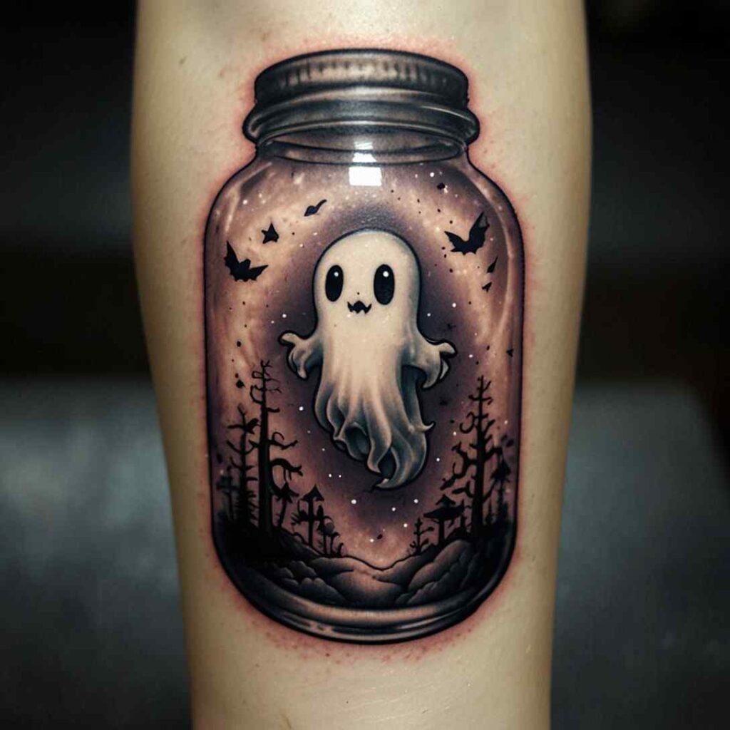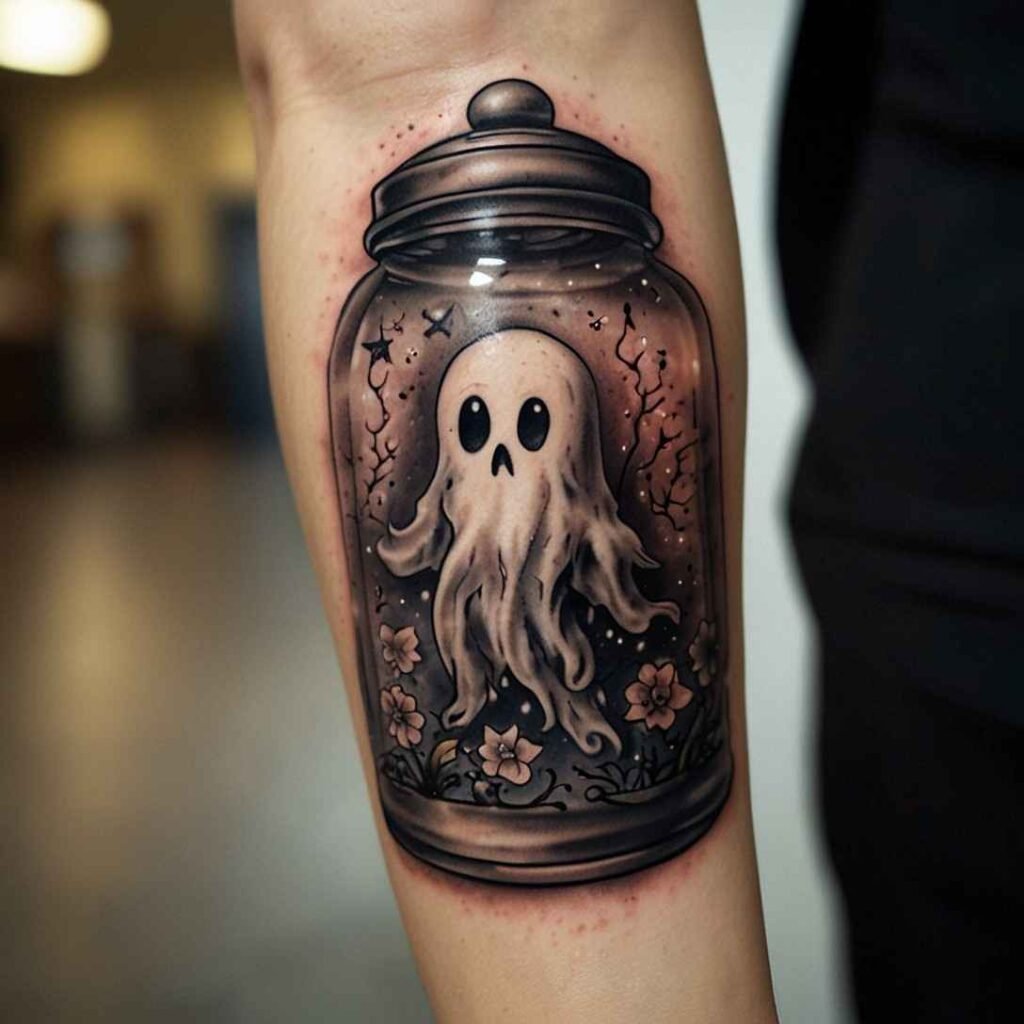 A ghost in a jar tattoo is a creative and unique concept. It symbolizes containing fears or keeping a part of the unknown locked away, only to be observed. This design often has a ghost floating inside a tiny glass jar, adding a sense of curiosity and intrigue. The jar can be detailed or simple, depending on your style. Place this tattoo on your forearm or thigh for a quirky yet meaningful piece of art.