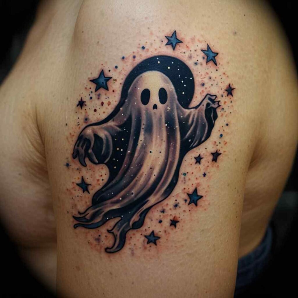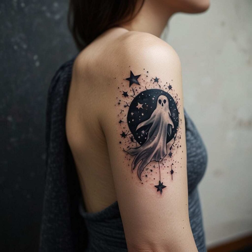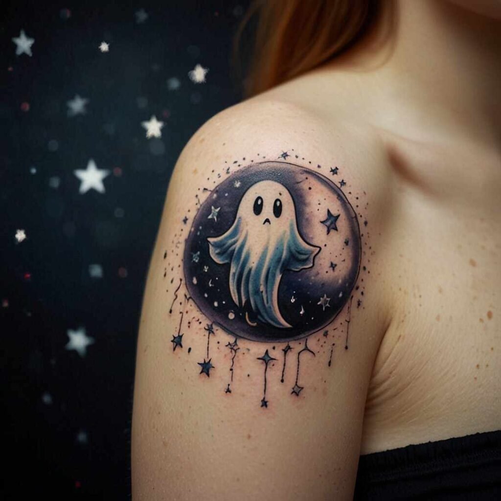 A mini ghost surrounded by stars can symbolize the mystery of the universe and the unknown. It’s perfect for people who are fascinated by space or want a tattoo that represents their curiosity about the world beyond. The stars add a celestial touch to the design, making it both magical and mysterious. This tattoo looks great on the arm or shoulder, offering a cosmic feel in a small package.