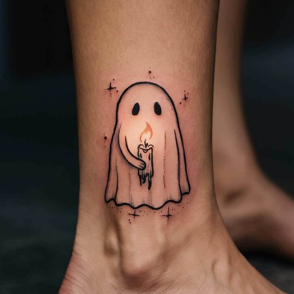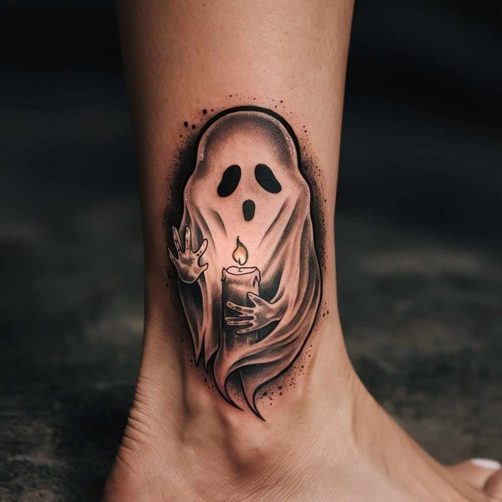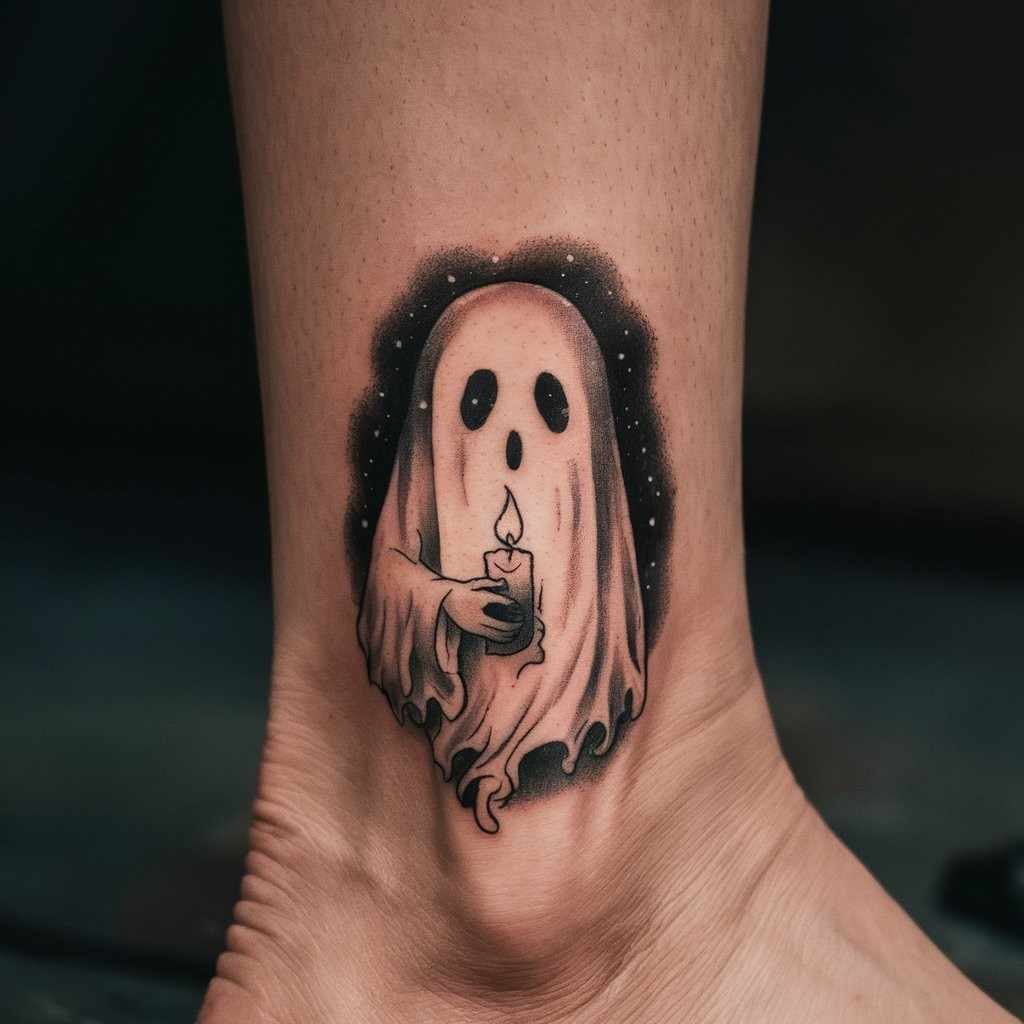 A ghost holding a candle can symbolize guidance through the dark or lighting the way in uncertain times. The candle represents hope, while the ghost embodies the unknown. This tattoo is perfect for people who want a small, meaningful design that speaks to overcoming challenges. You can place this tattoo on your forearm or ankle for a subtle yet significant piece of ink.