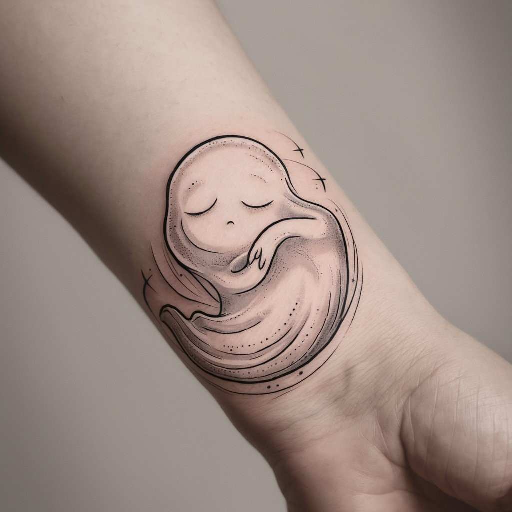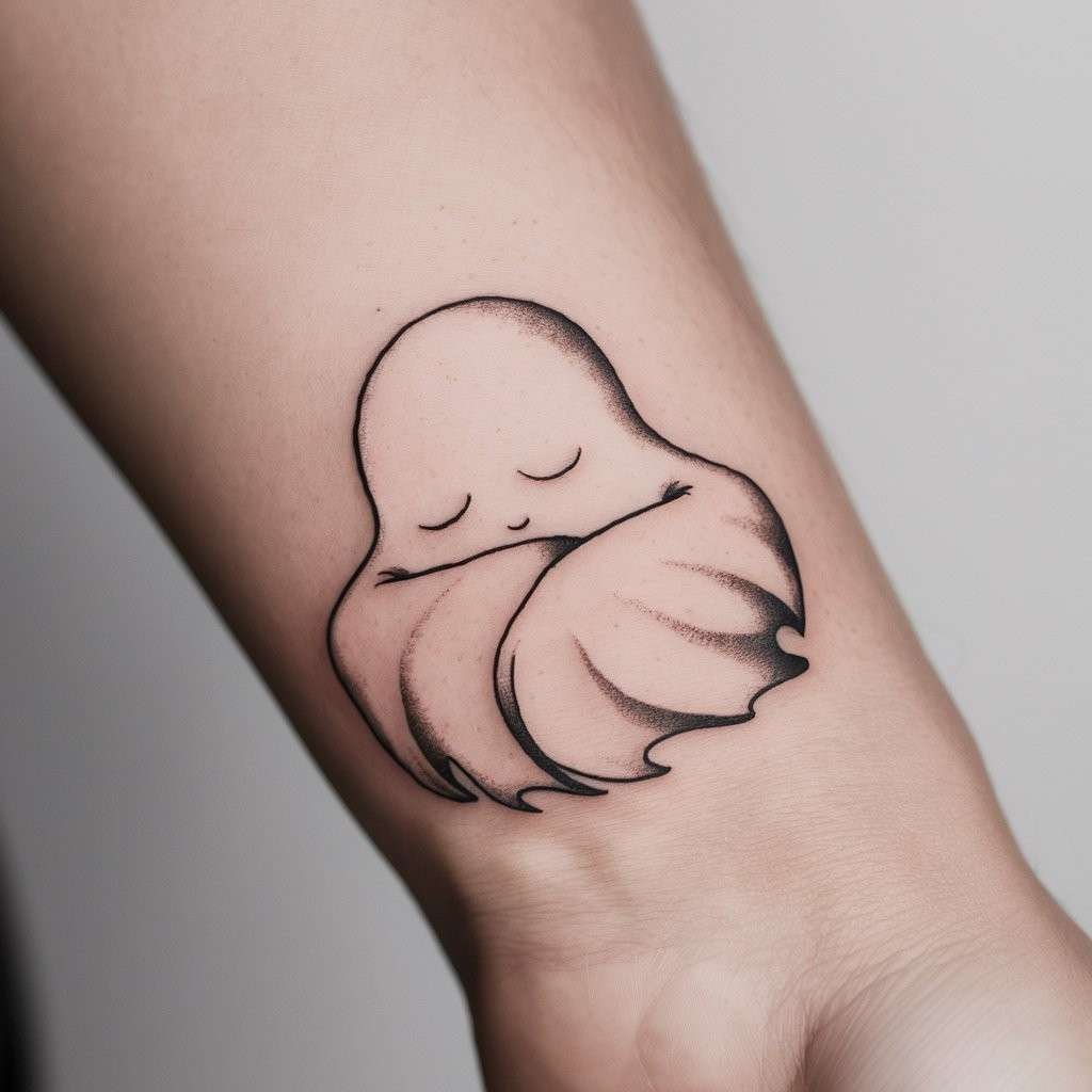 A mini tattoo of a sleeping ghost is simple and peaceful. It can represent rest, tranquility, or letting go of stress and worries. The ghost is usually shown with closed eyes and a relaxed expression. This tattoo is ideal for those who want to symbolize peace in their life or someone who’s learning to rest in uncertain times. It’s small enough to fit on your wrist or behind your ear.